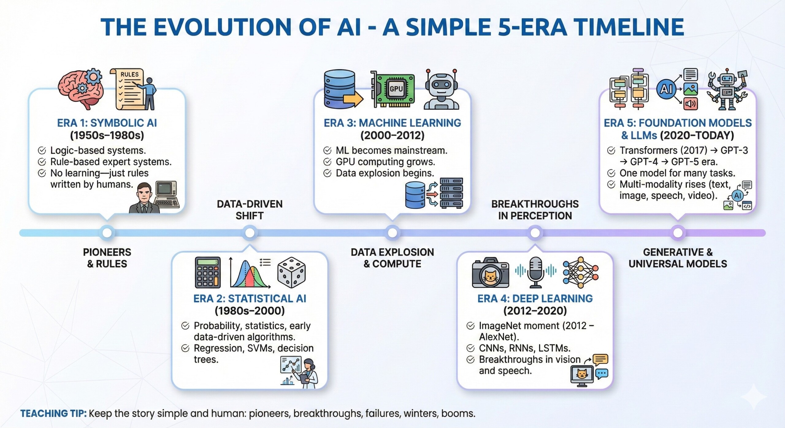 - Statistical & Machine Learning Era (1990s–2010s): Neural networks, SVMs, and probabilistic models powered speech recognition and computer vision.