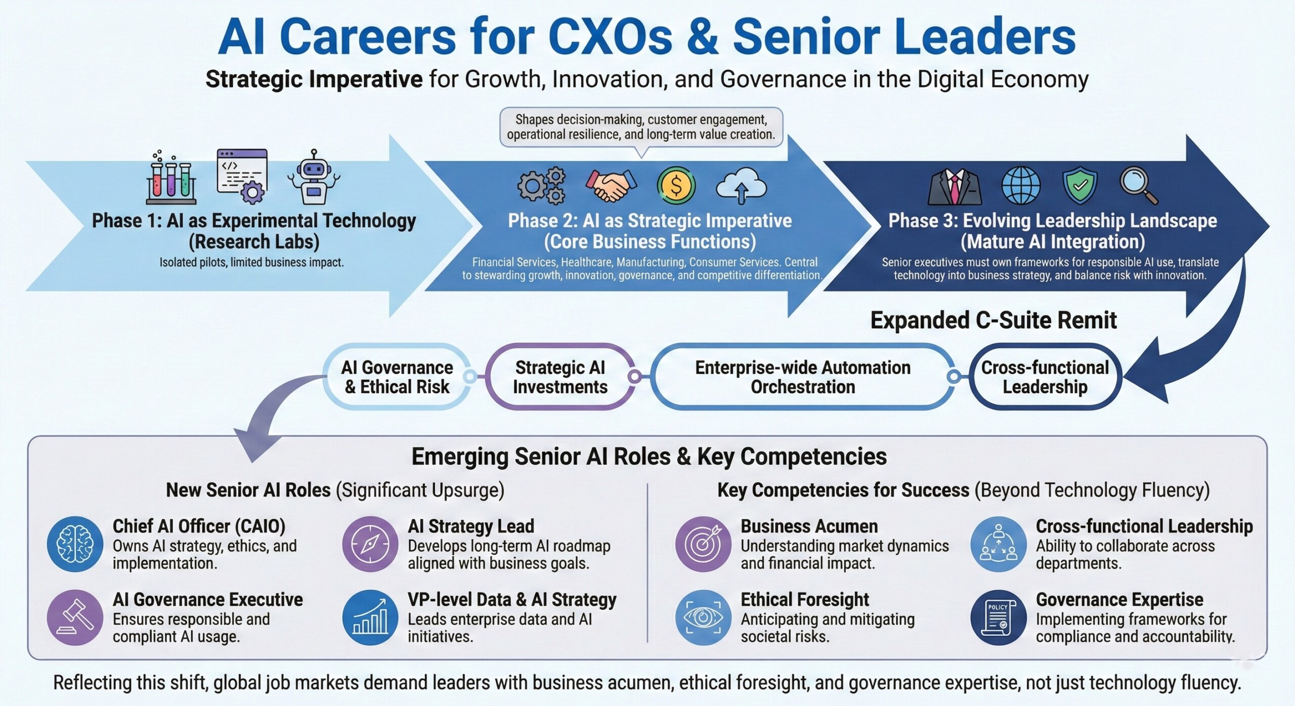 Reflecting this shift, global job markets show a significant upsurge in senior AI roles – from Chief AI Officers to AI Strategy Leads, AI Governance Executives, and VP-level data and AI strategy positions. These roles are not only about technology fluency; they demand business acumen, cross-functional leadership, ethical foresight, and governance expertise.