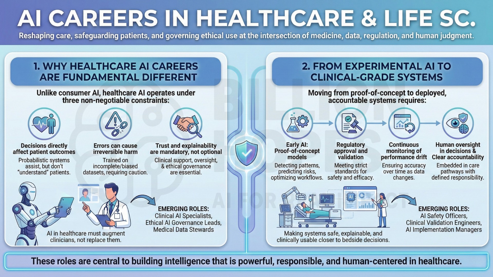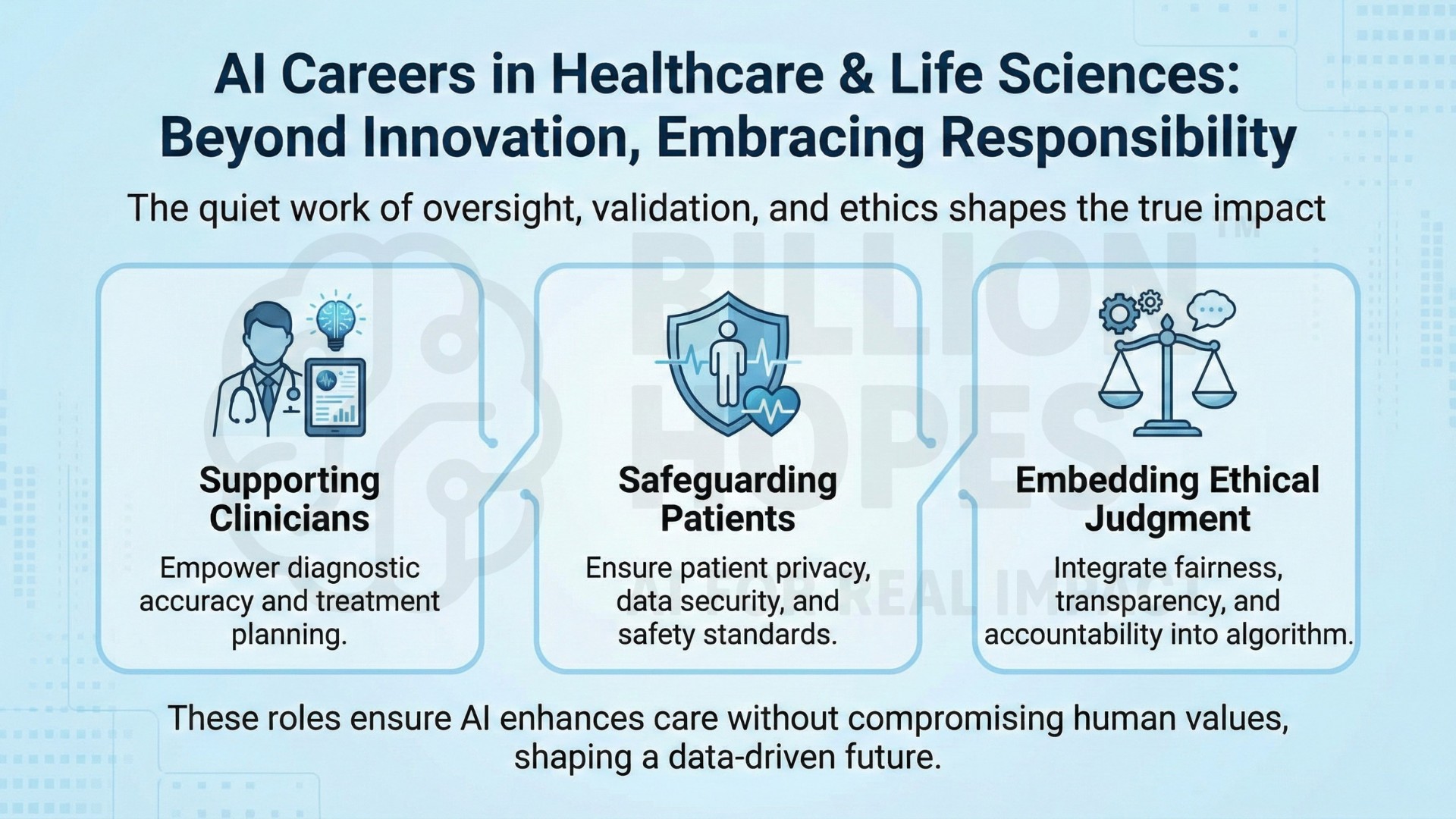 Yet healthcare is not a domain where AI can operate unchecked. Lives, dignity, safety, and trust are at stake. This reality has created a distinct and growing class of AI careers focused not just on building models, but on supporting clinicians, safeguarding patients, and governing ethical use. These roles sit at the intersection of medicine, data, regulation, and human judgment.