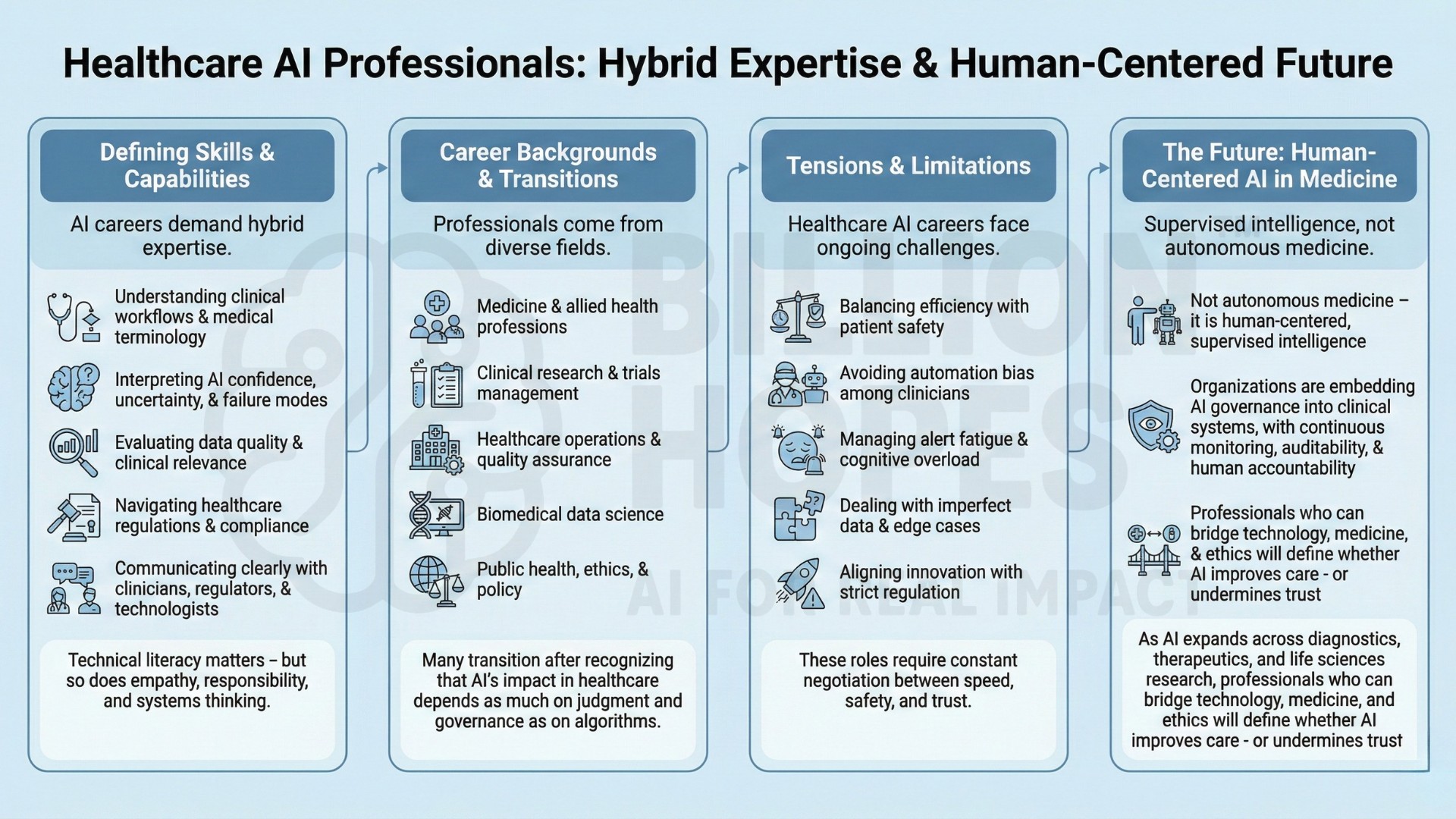 AI careers in healthcare demand hybrid expertise. Key capabilities include: