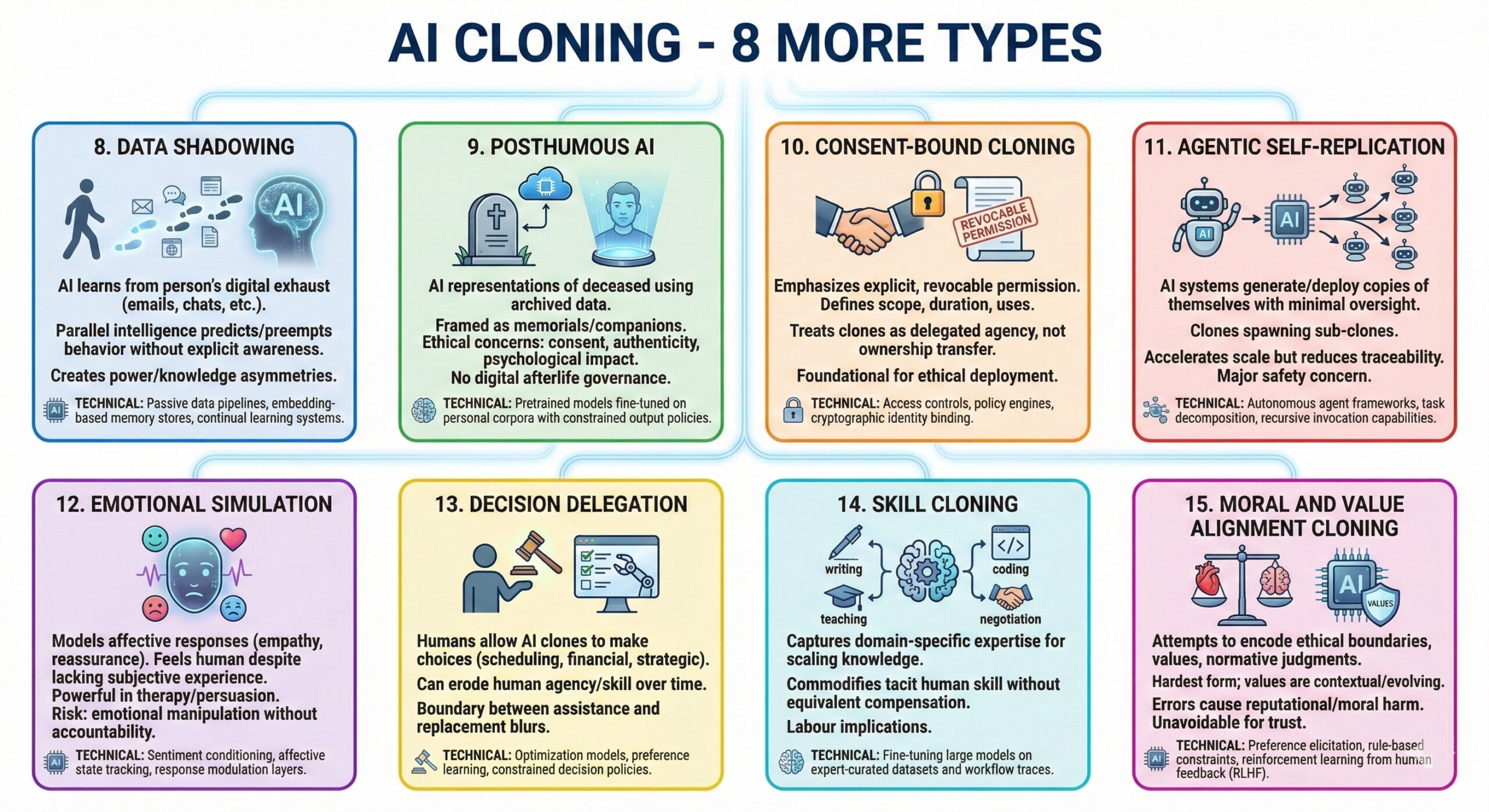 This concept attempts to encode a person’s ethical boundaries, values, and normative judgments into AI behavior. It is the hardest form of cloning because values are contextual and evolving. Errors here can cause reputational or moral harm at scale. Yet it is unavoidable for trusted delegation.