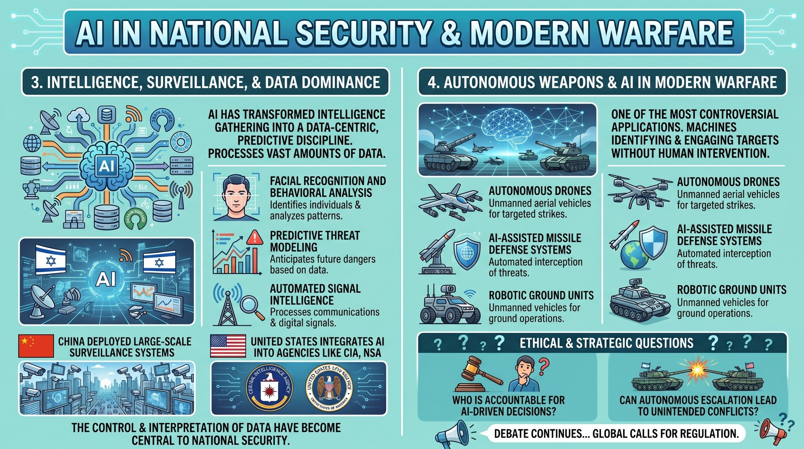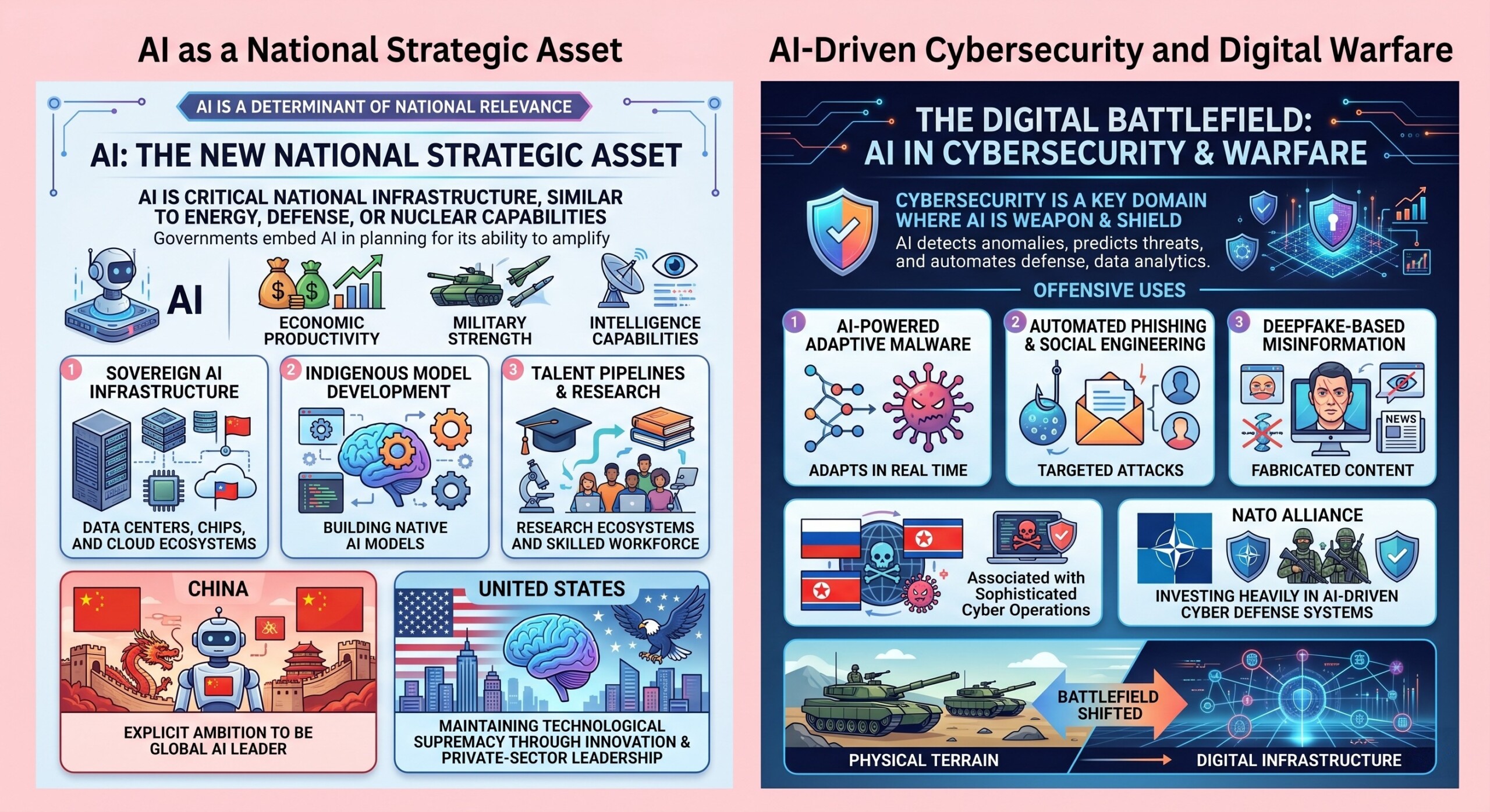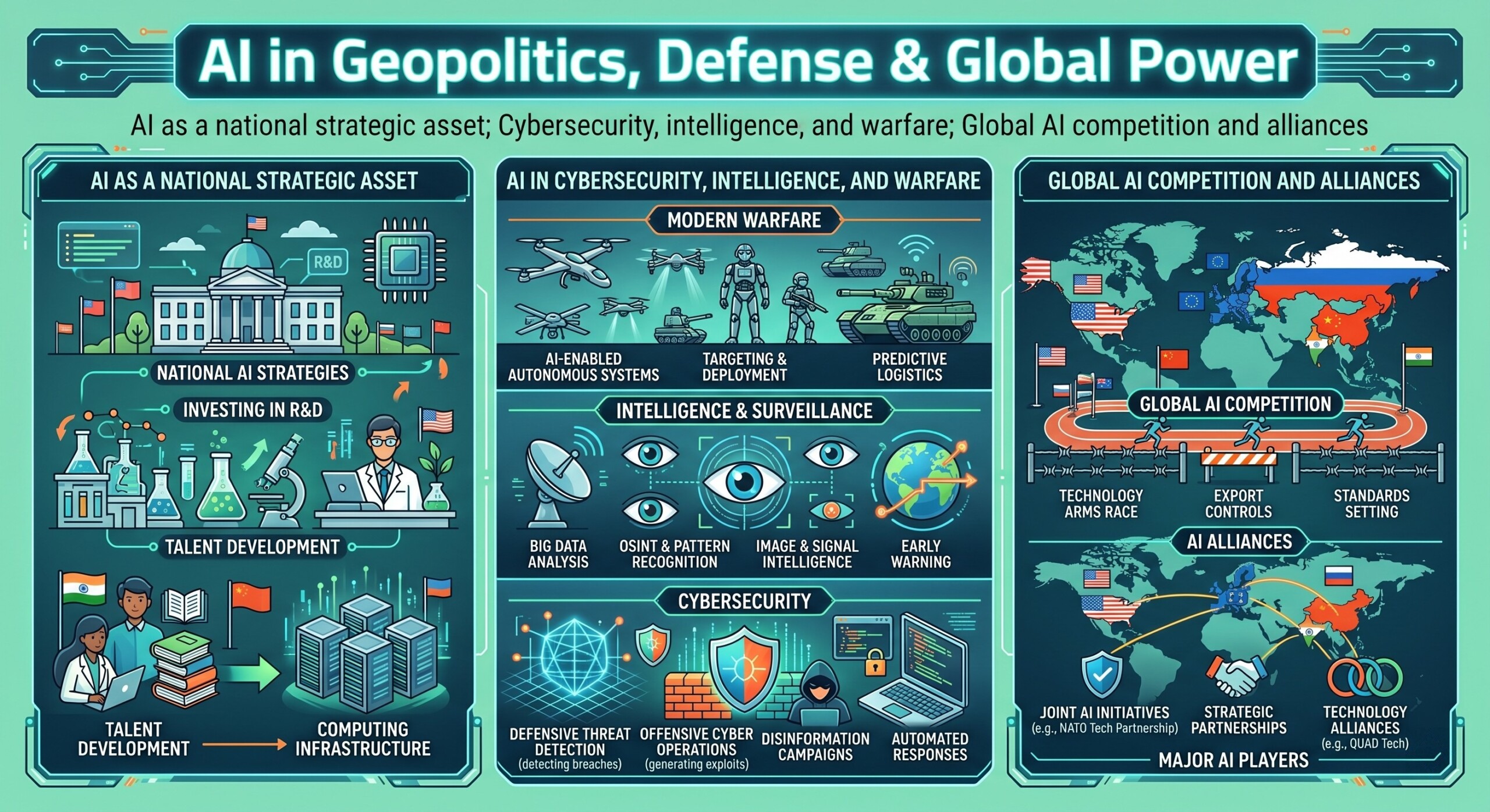 AI as a national strategic asset; Cybersecurity, intelligence, and warfare; Global AI competition and alliances
