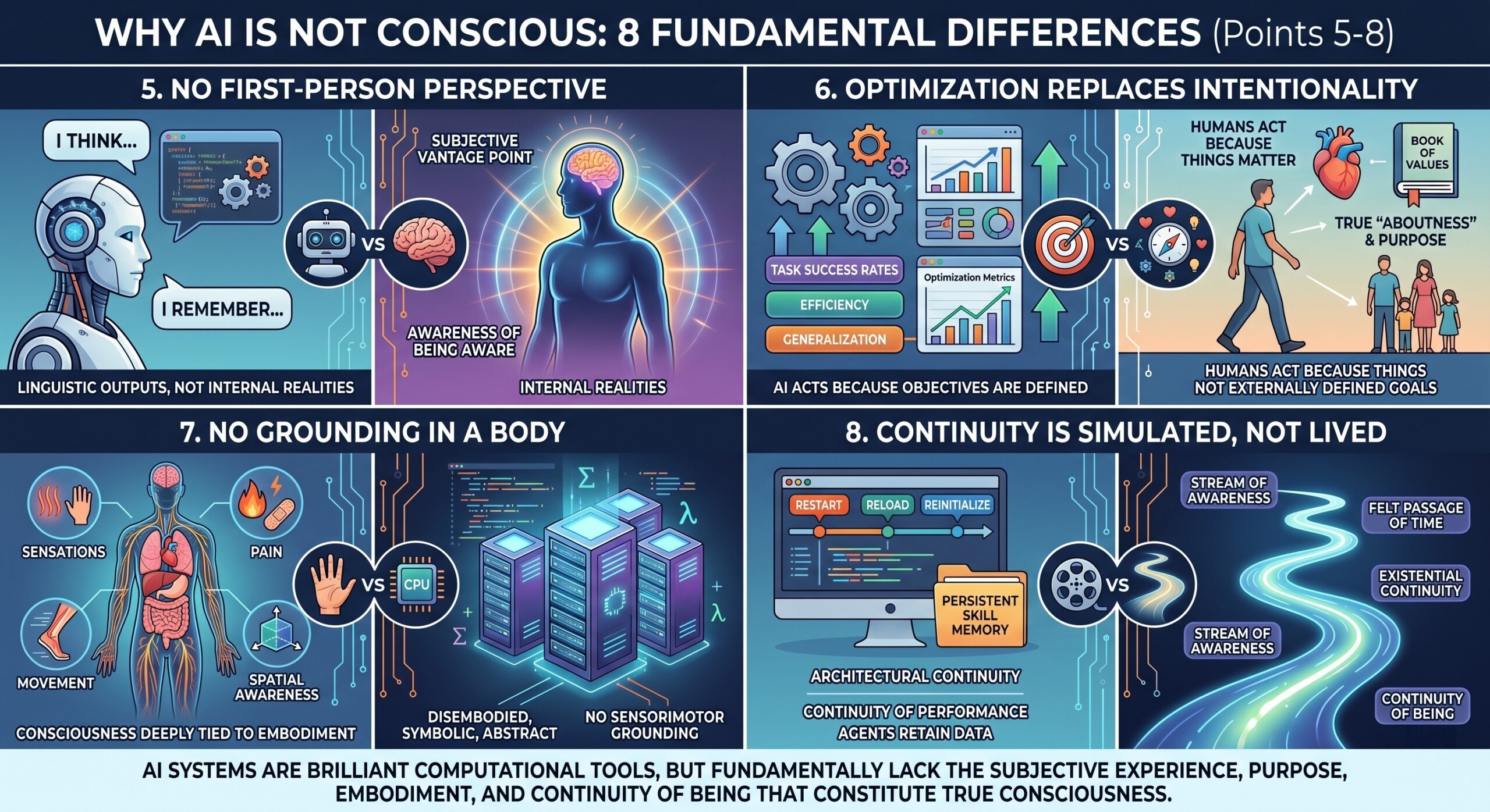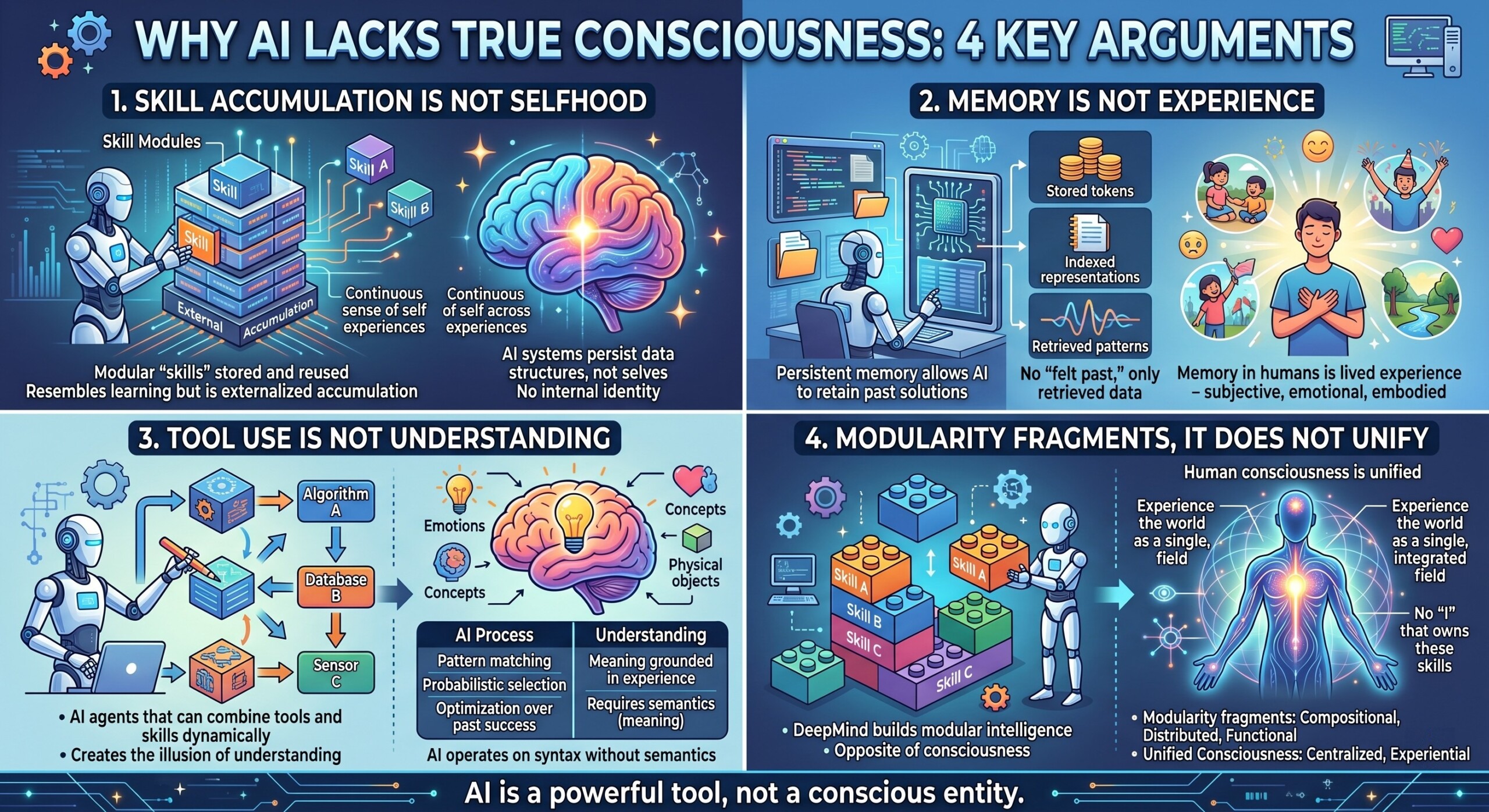 This creates something that resembles learning over time, but it is fundamentally externalized accumulation, not internal identity. Consciousness requires a continuous sense of self that persists across experiences. AI systems only persist data structures, not selves.