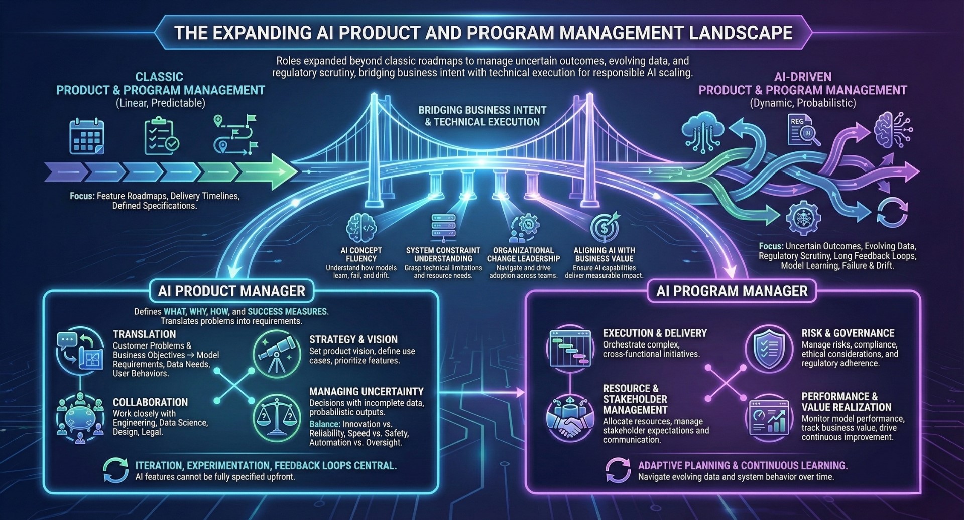 AI product and program roles have expanded well beyond classic feature roadmaps and delivery timelines. Modern AI initiatives involve uncertain outcomes, evolving data, regulatory scrutiny, and long feedback loops. Product and program managers must understand how models learn, fail, and drift over time, while aligning AI capabilities with measurable business value.