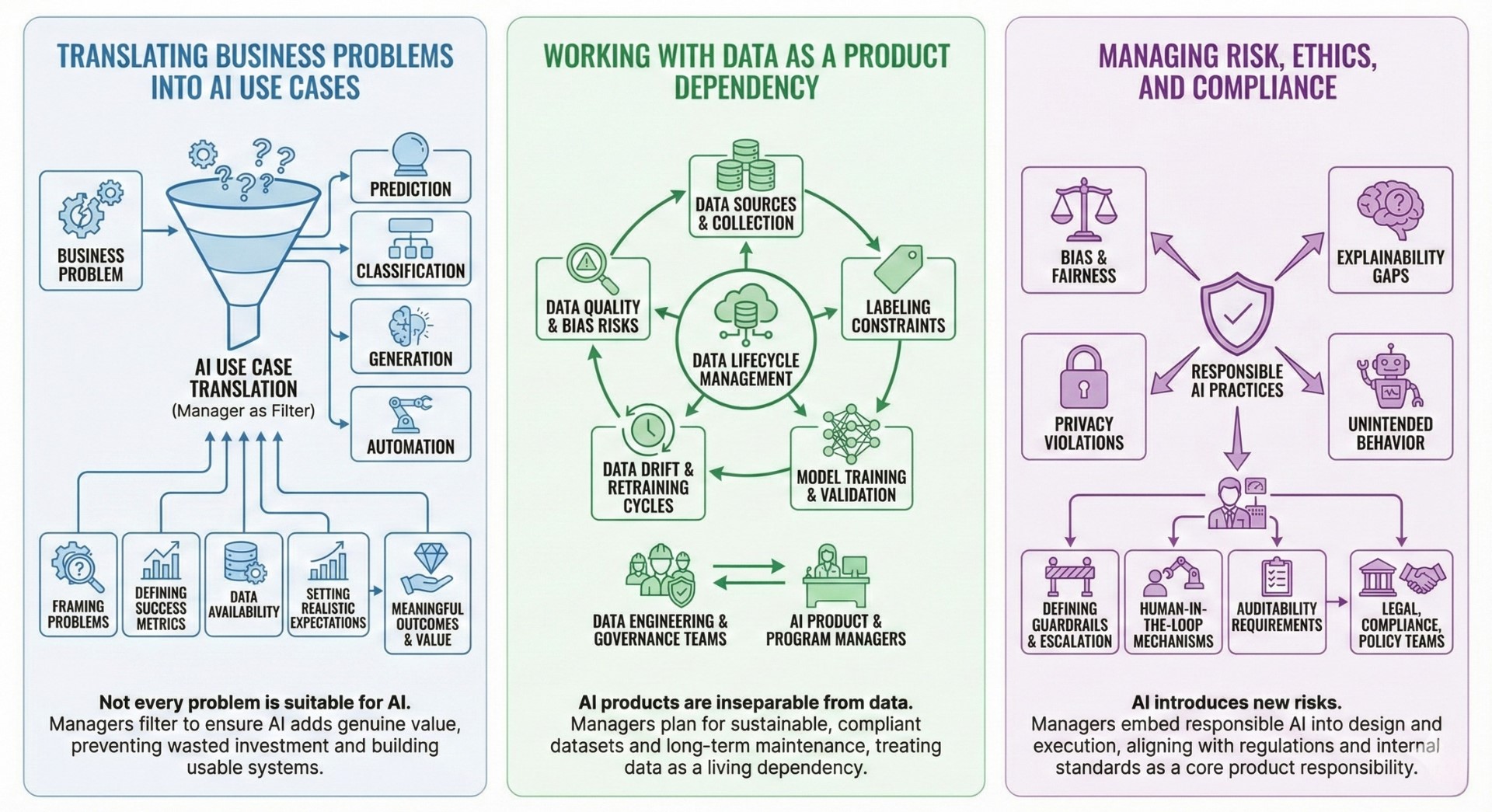 In practice, managers work closely with data engineering and governance teams to ensure datasets are representative, compliant, and sustainable. They must plan for data drift, retraining cycles, and long-term maintenance. Treating data as a living product dependency is essential for AI systems that remain useful over time.