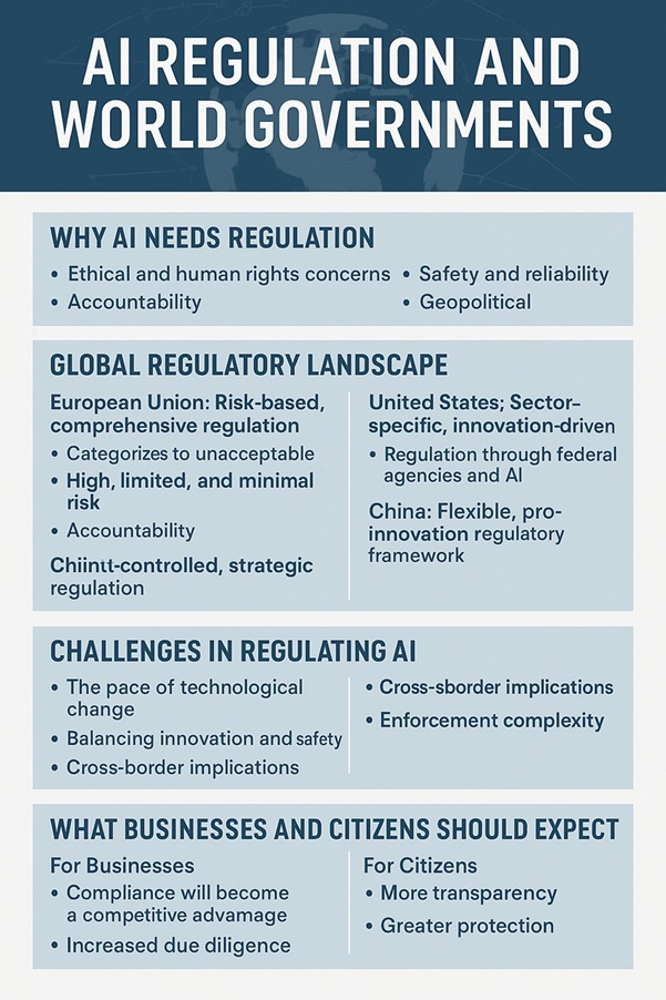 Artificial intelligence (AI) is transforming economies, reshaping industries, and altering the way societies function. Its potential is enormous—from diagnosing diseases and optimizing supply chains to enabling autonomous vehicles and personalizing education. But with its rapid evolution comes a pressing challenge: how can governments regulate AI in a way that fosters innovation while protecting citizens from potential harm? Around the world, governments are wrestling with this question, often taking different paths based on political systems, economic priorities, and cultural values.