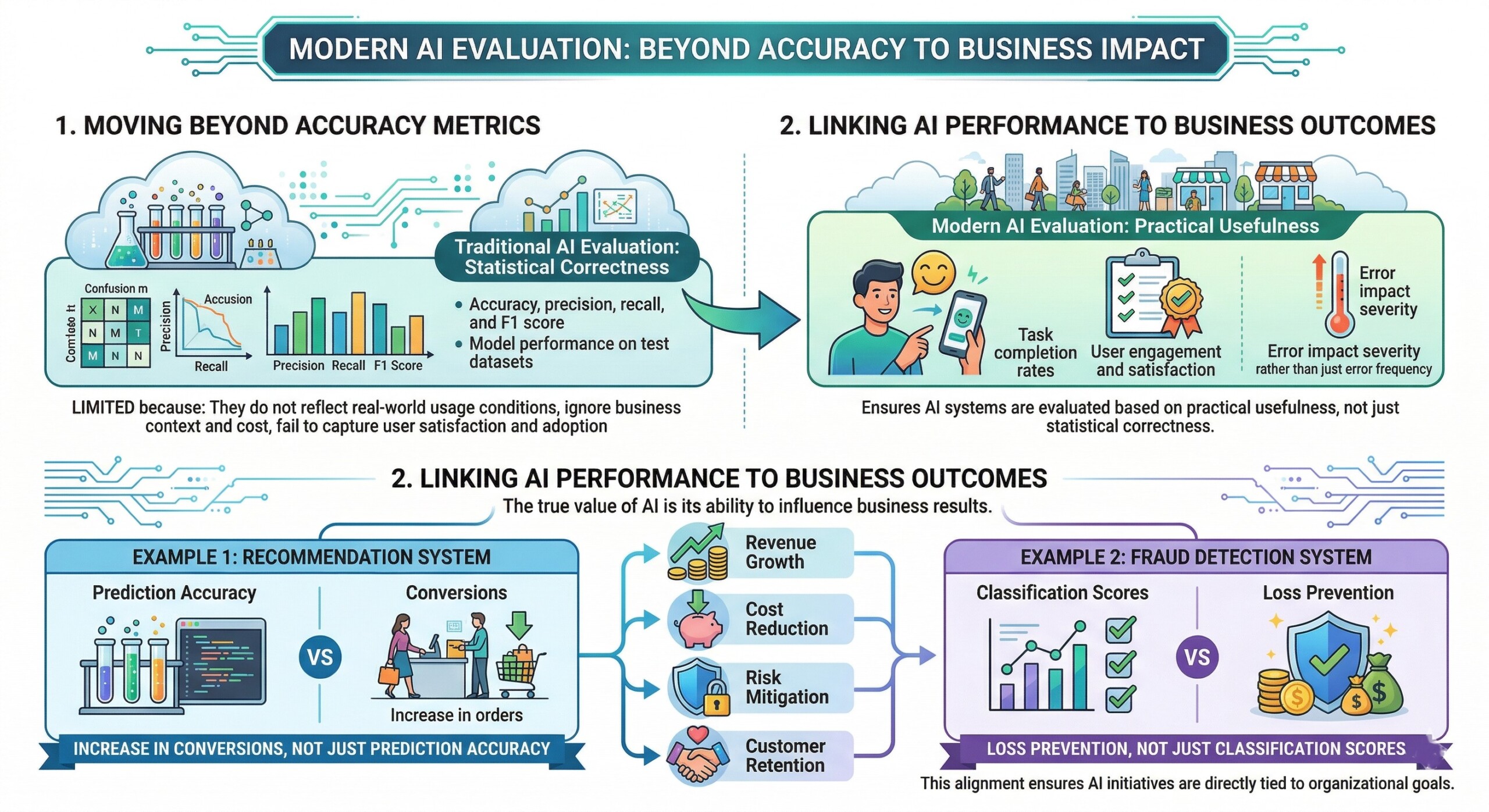Traditional evaluation methods in AI have focused primarily on technical metrics such as accuracy, precision, recall, and F1 score. While these metrics are important, they do not capture the full picture. A model can be highly accurate yet fail to generate meaningful business impact. Conversely, a moderately accurate system may drive significant cost savings or productivity improvements.