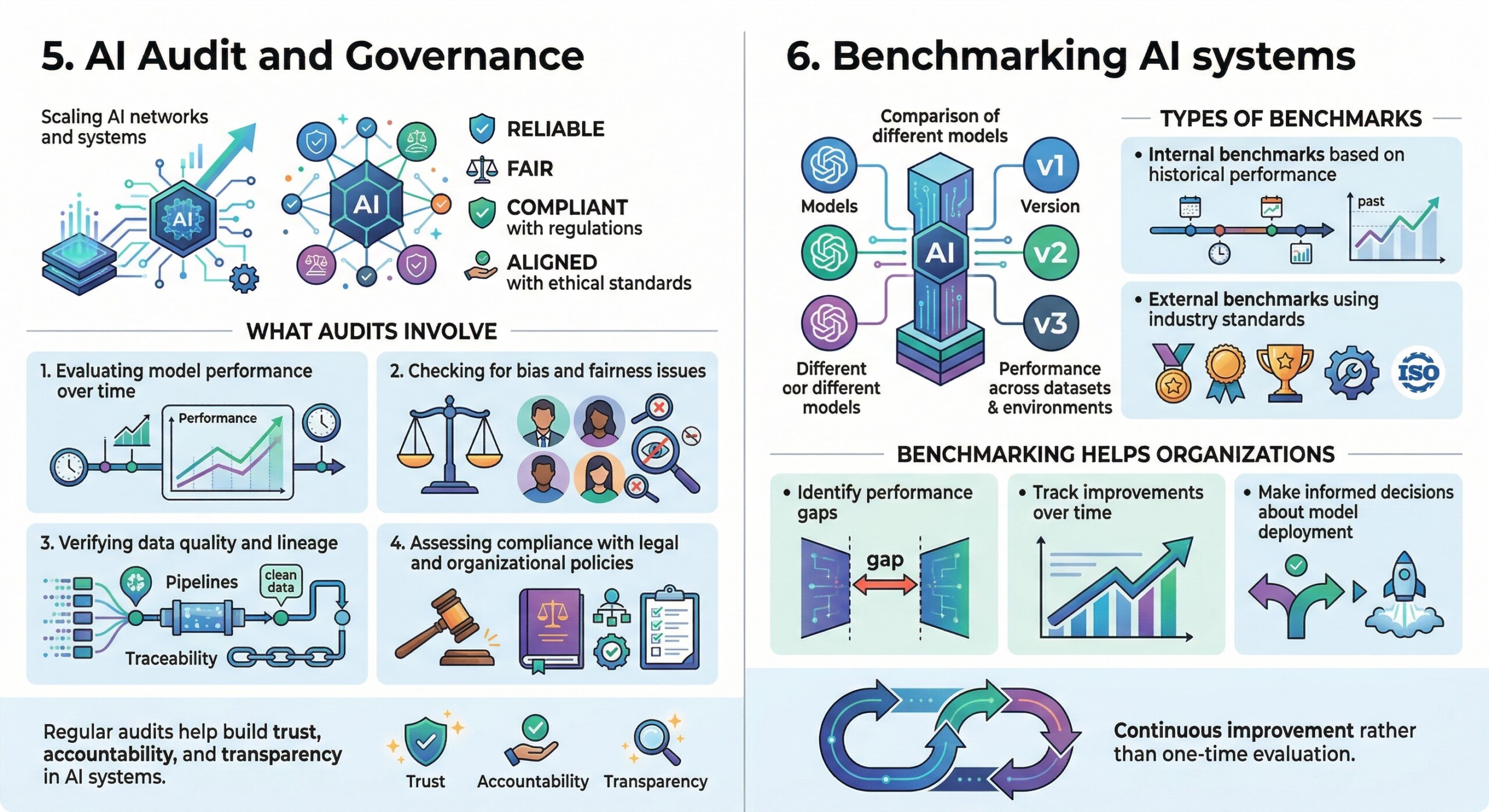 Measuring AI performance beyond accuracy; Business ROI and productivity metrics; AI audit, benchmarking, and reporting