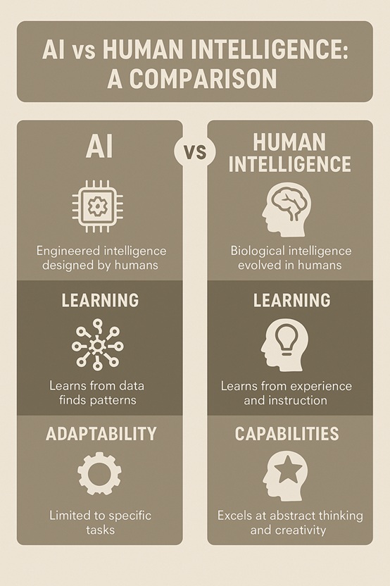 Artificial Intelligence (AI) and human intelligence are often compared, but they fundamentally differ in structure, capability, adaptability, and origin. Understanding their distinctions is crucial to framing expectations about what AI can—and cannot—achieve.