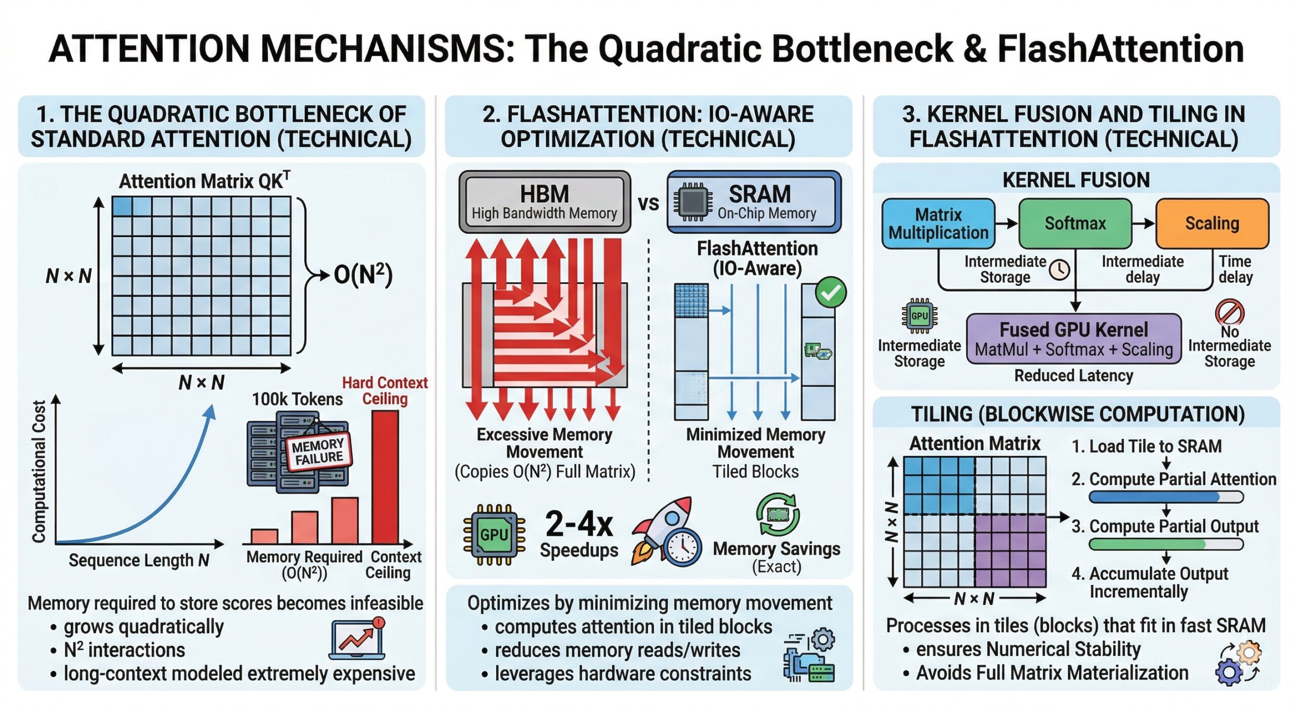 FlashAttention is a breakthrough technique that optimizes attention computation by minimizing memory movement between GPU high-bandwidth memory (HBM) and on-chip SRAM. Instead of storing the full attention matrix, it computes attention in tiled blocks.