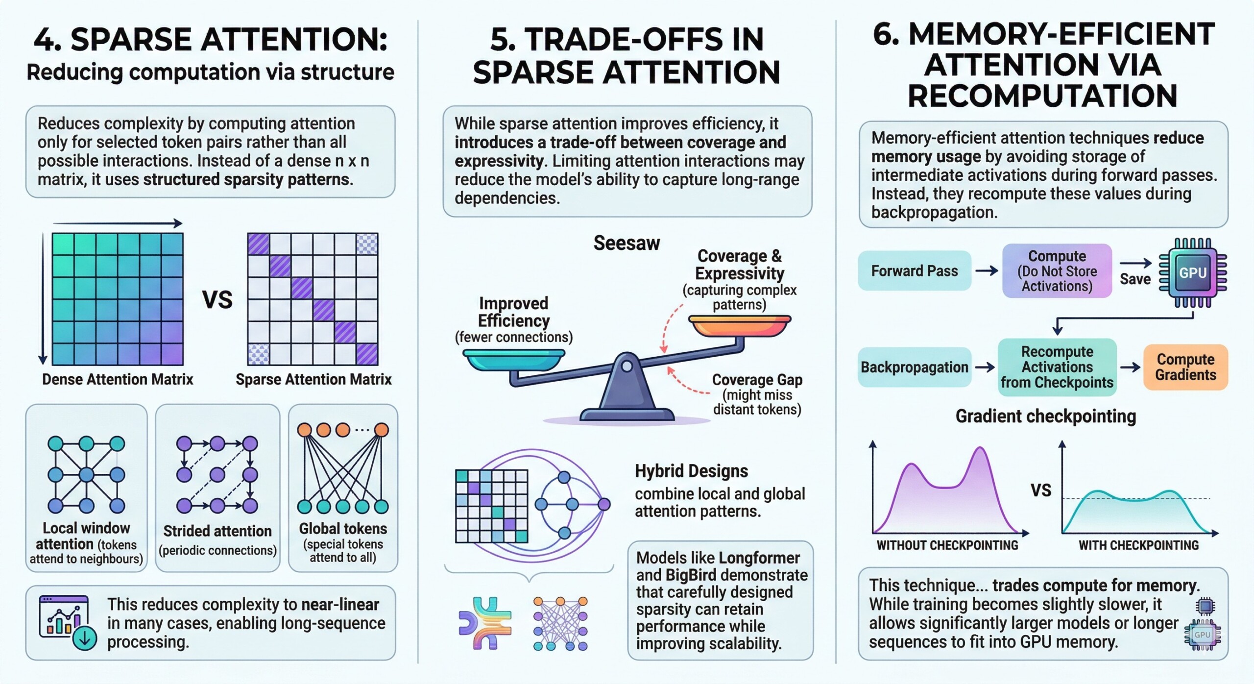 Sparse attention reduces complexity by computing attention only for selected token pairs rather than all possible interactions. Instead of a dense n × n matrix, it uses structured sparsity patterns.