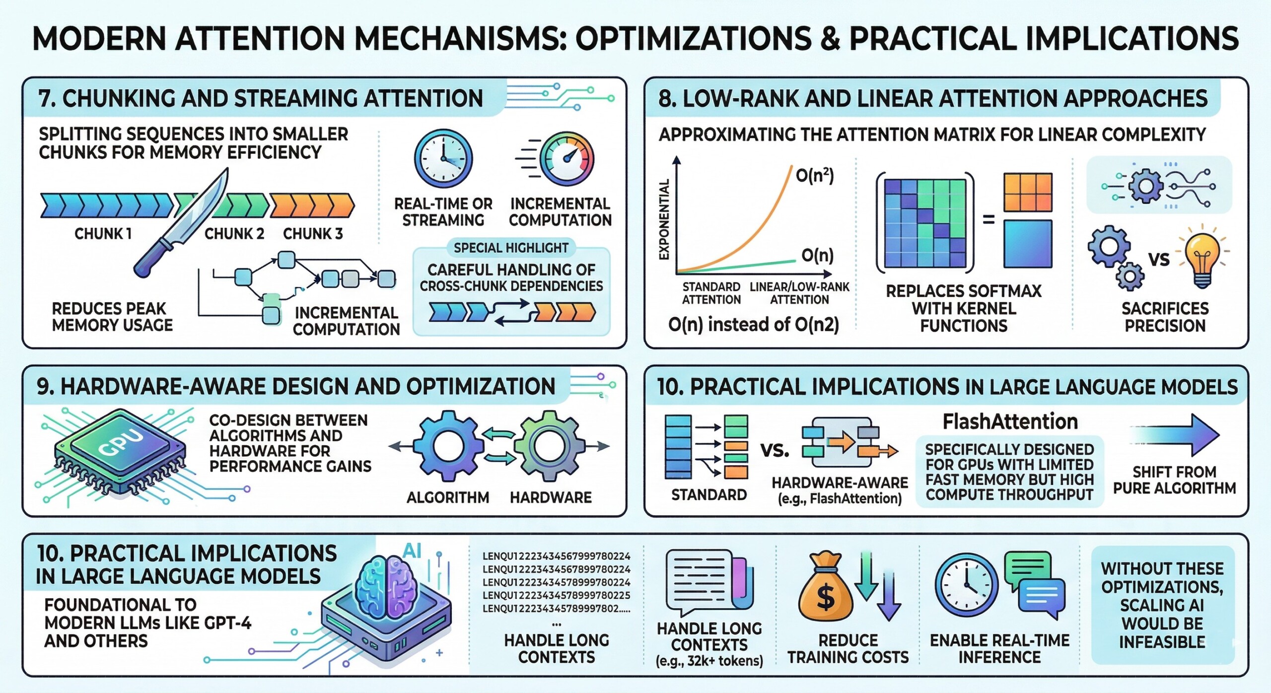 Together, these approaches represent a broader trend: the evolution of AI from purely mathematical models to system-level engineering disciplines. The future of attention mechanisms will likely involve hybrid approaches – combining exact computation, sparsity, approximation, and hardware-aware design.