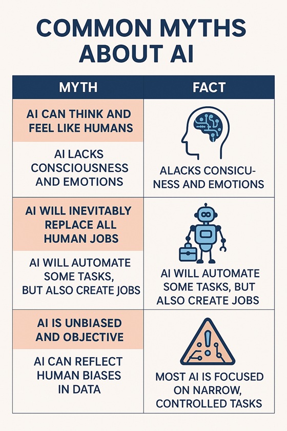 Another common myth is that AI will inevitably replace all human jobs. While AI will automate certain tasks, particularly those that are repetitive and rules-based, it will also create new types of jobs that demand creativity, emotional intelligence, critical thinking, and AI oversight. The future workforce will be reshaped, not eradicated, by AI.