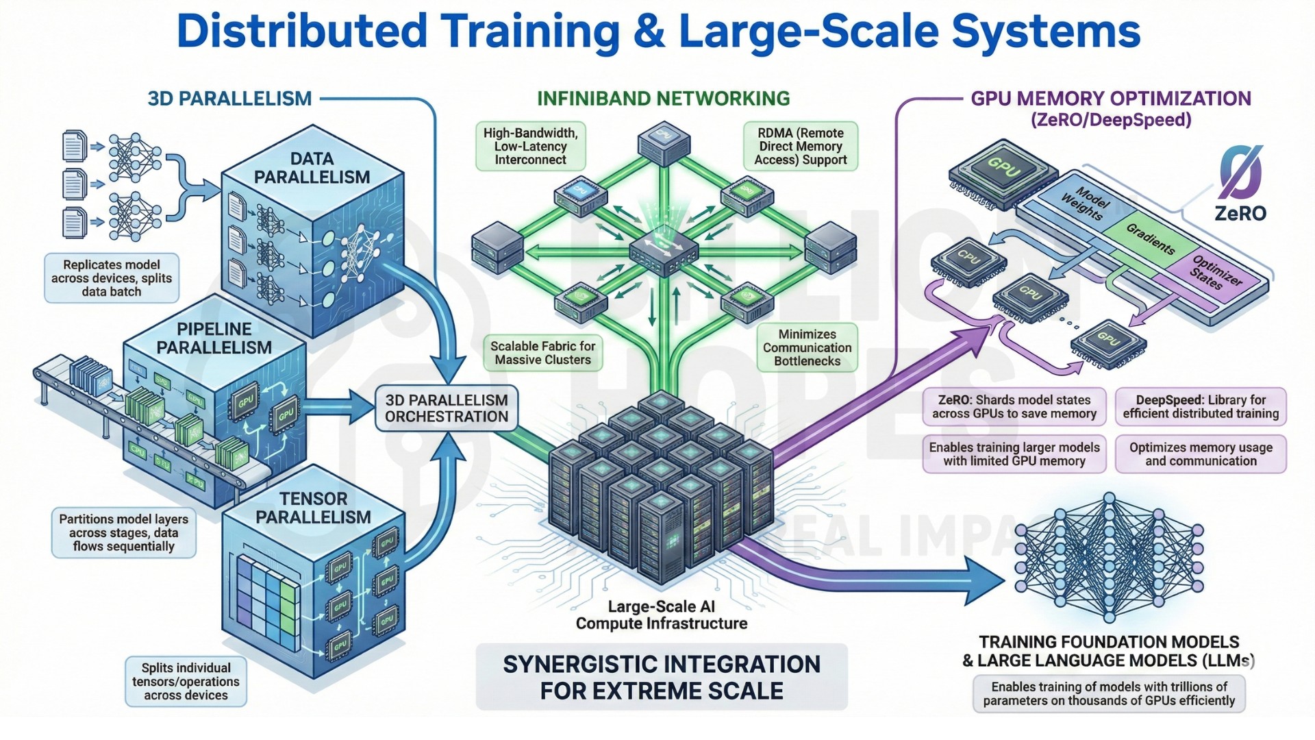 Distributed training reframes deep learning as a large-scale systems engineering problem. Techniques like 3D parallelism (data, pipeline, and tensor parallelism), InfiniBand-class networking, and memory optimization frameworks such as DeepSpeed ZeRO enable models that exceed single-node limits. This shift turns AI training into a co-design problem between algorithms, hardware, networking, and distributed software systems.