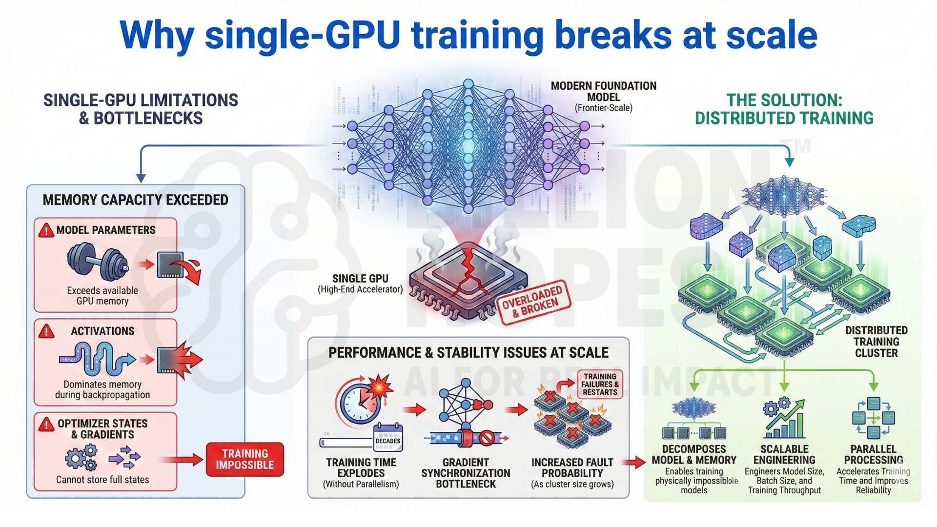 Modern foundation models exceed the memory and compute limits of any single GPU. Even high-end accelerators cannot store full model parameters, activations, optimizer states, and gradients for frontier-scale training.