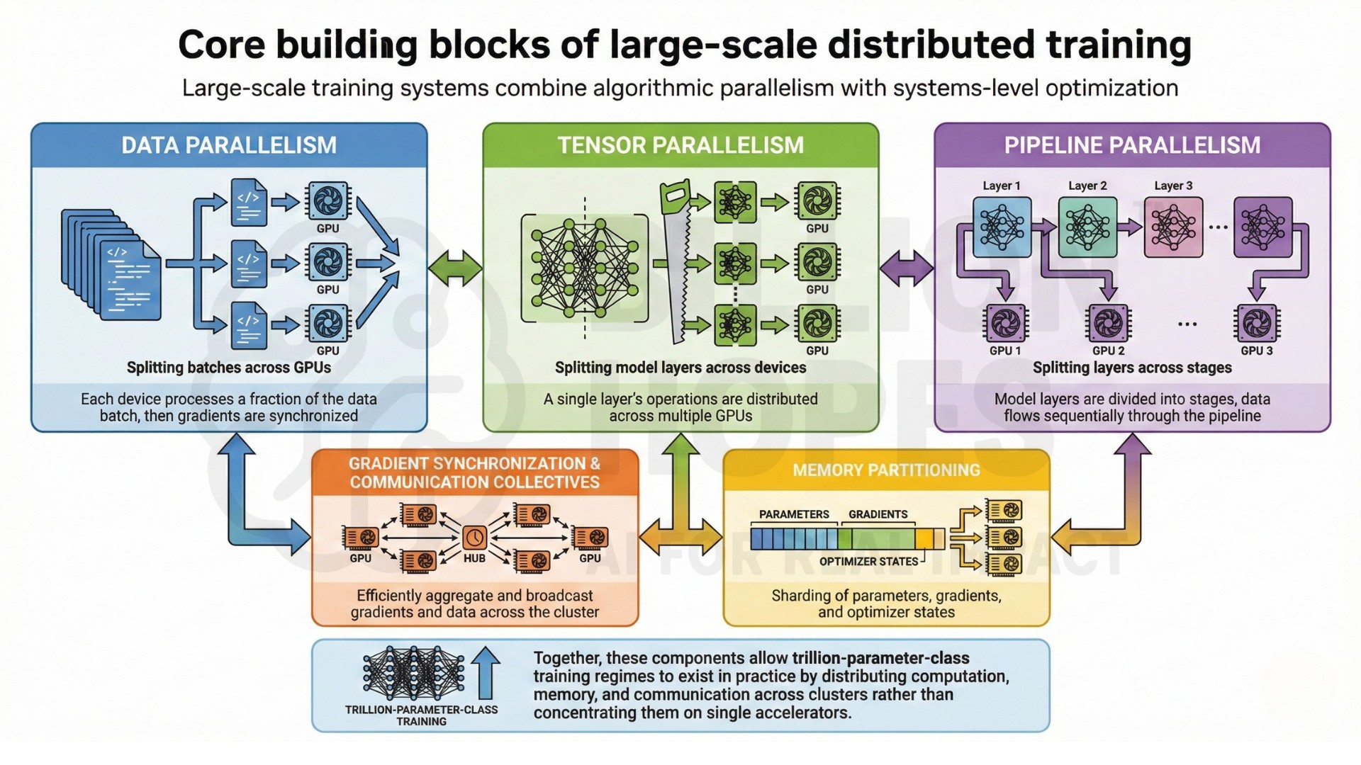 Together, these components allow trillion-parameter-class training regimes to exist in practice by distributing computation, memory, and communication across clusters rather than concentrating them on single accelerators.
