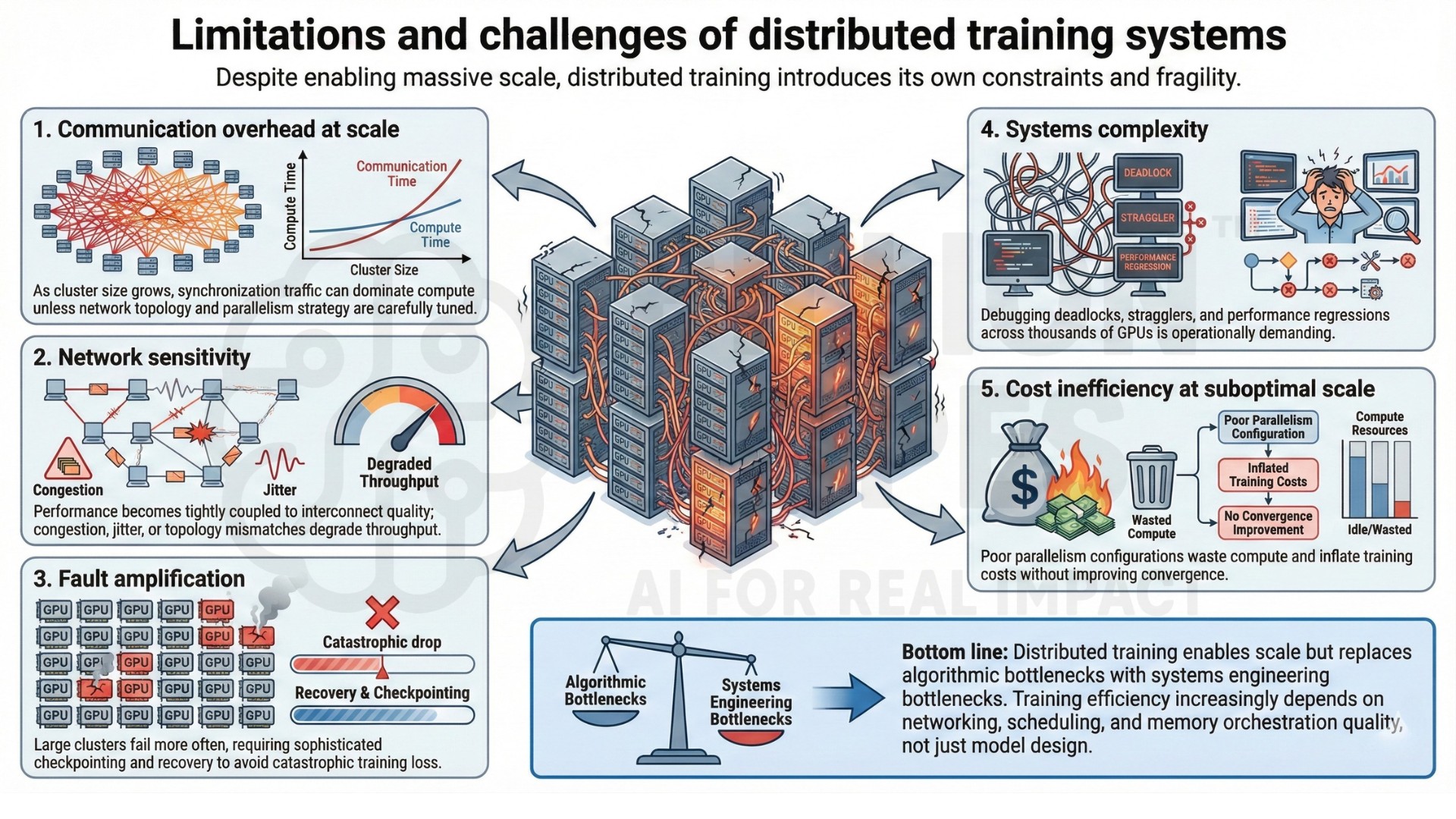Despite enabling massive scale, distributed training introduces its own constraints and fragility.