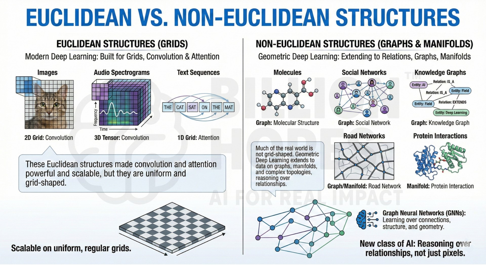 Molecules, social networks, knowledge graphs, road networks, and protein interactions are relational structures. Geometric Deep Learning extends deep learning to these non-Euclidean domains, where data lives on graphs, manifolds, and complex topologies.