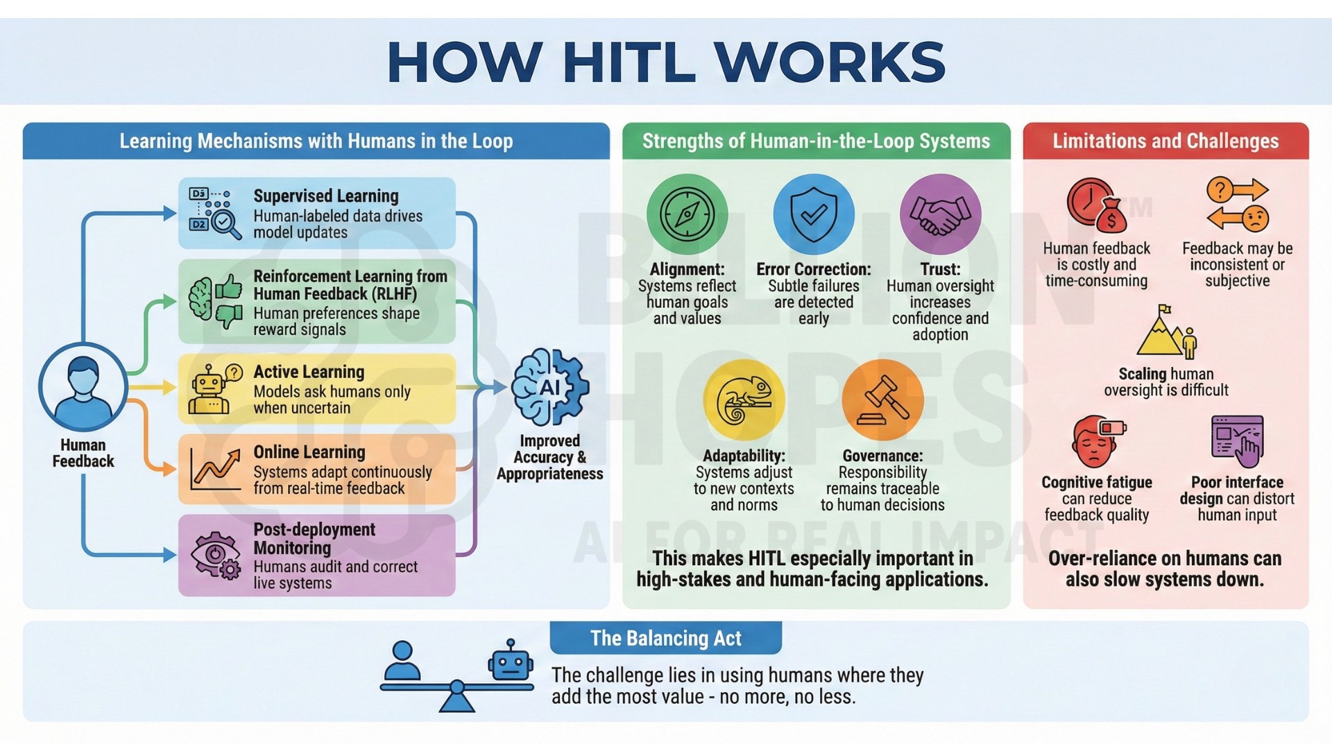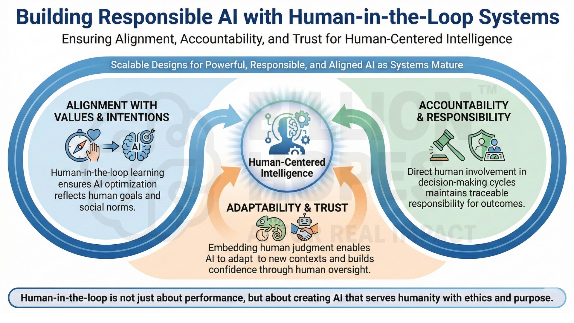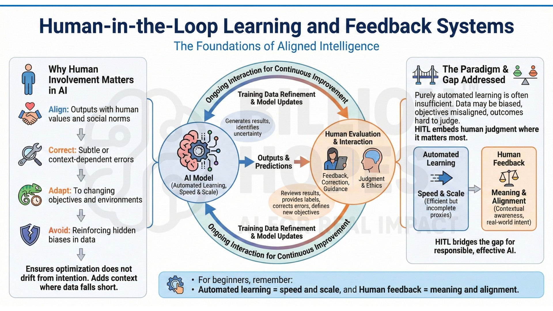 Human-in-the-loop learning ensures that optimization does not drift away from intention. It adds judgment, ethics, and contextual awareness where data alone falls short.