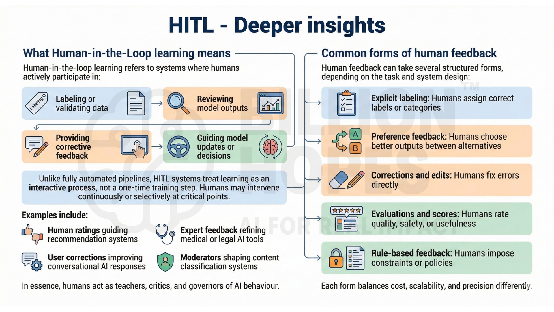 Unlike fully automated pipelines, HITL systems treat learning as an interactive process, not a one-time training step. Humans may intervene continuously or selectively at critical points.