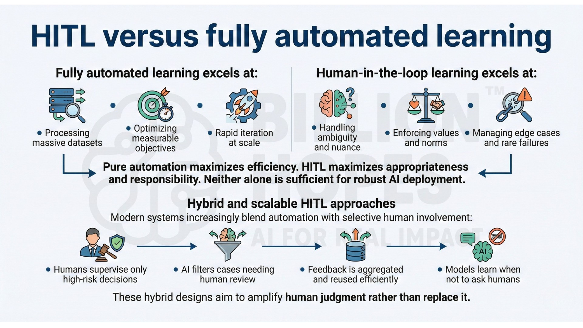 Pure automation maximizes efficiency. HITL maximizes appropriateness and responsibility. Neither alone is sufficient for robust AI deployment.