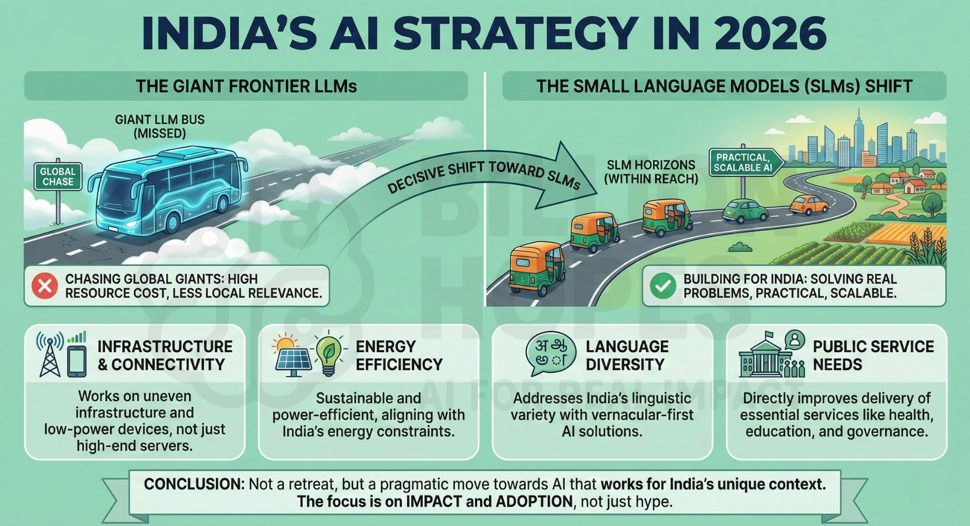 India’s AI strategy in 2026 is quietly but decisively shifting away from chasing giant frontier LLMs toward building Small Language Models (SLMs) that solve real Indian problems. This is perhaps not a retreat from ambition, but a move toward practical, scalable AI that works within India’s infrastructure, energy, language diversity, and public service needs. The LLM bus is missed, but the SLM horizons are within reach.