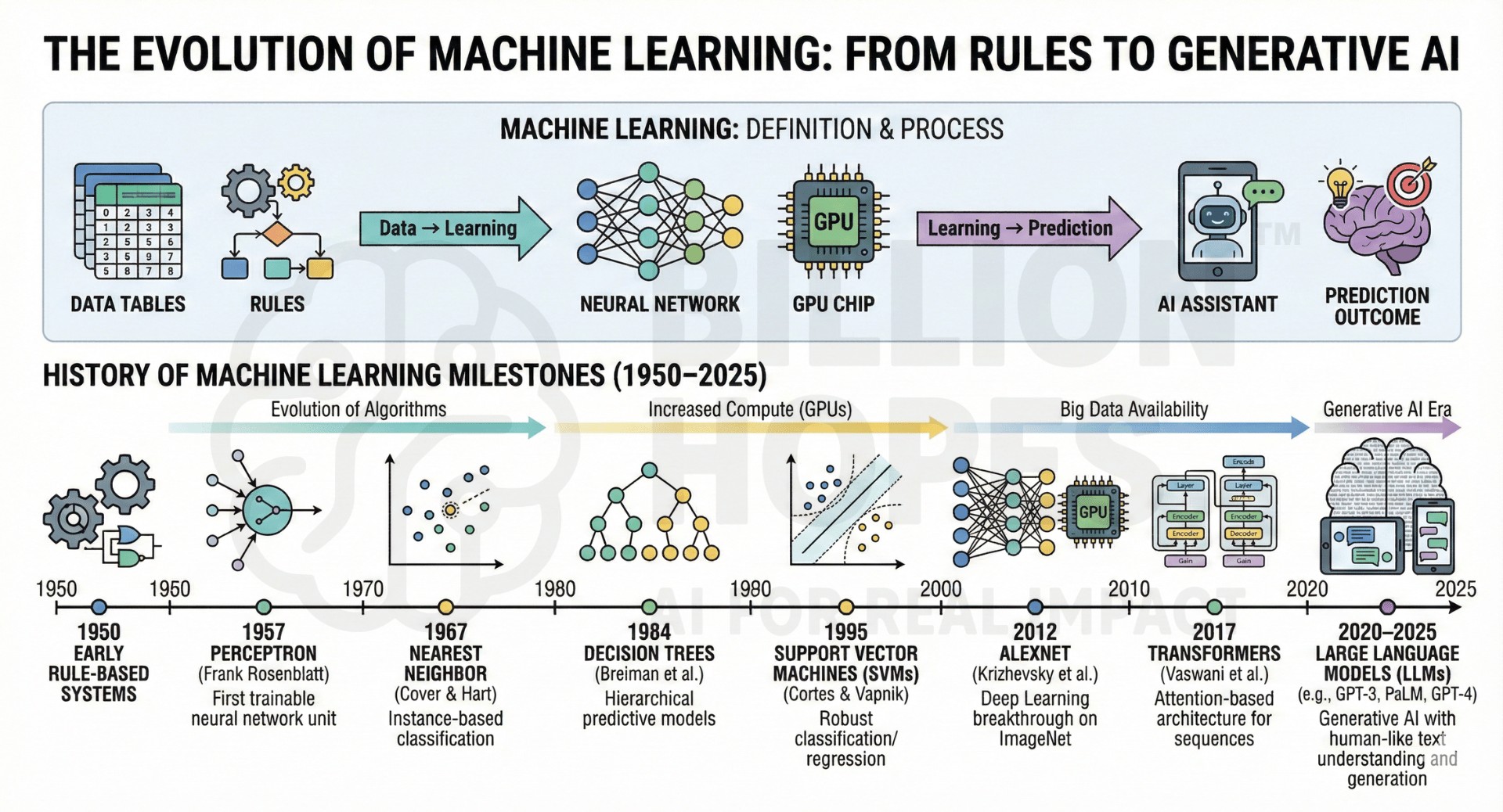 ML emerged from statistics, optimization, and computing theory. Early algorithms – like perceptrons (1957), nearest neighbours (1967), and decision trees (1984) – laid the groundwork. But ML truly accelerated with increases in computing power, especially after the 2000s when NVIDIA GPUs enabled scalable neural-network training.