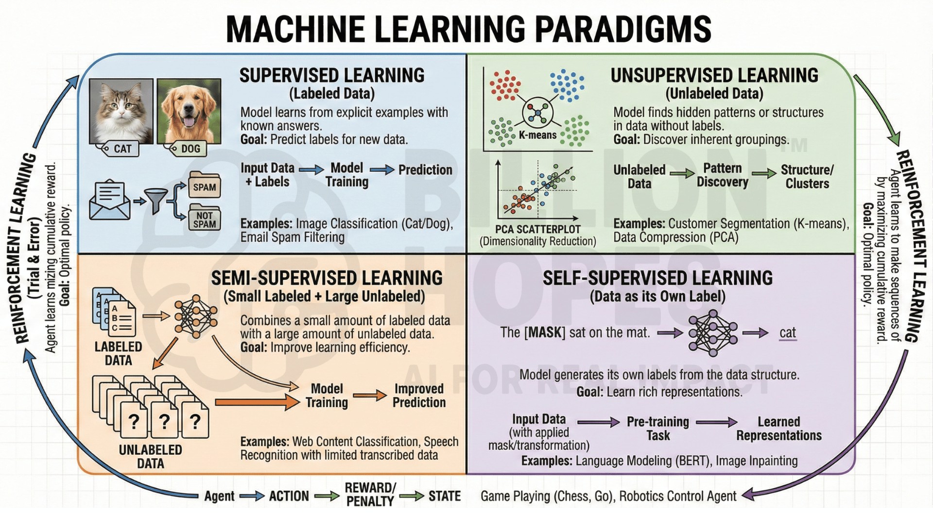 Machine learning has multiple paradigms, each suited to different problem types.