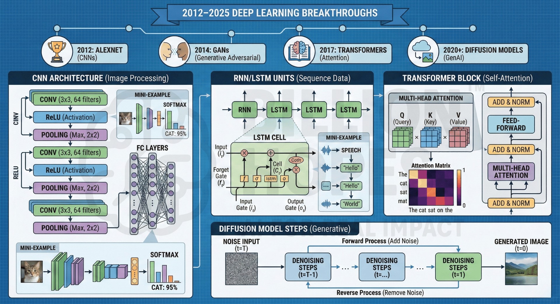 - 2014: GANs introduced by Ian Goodfellow.