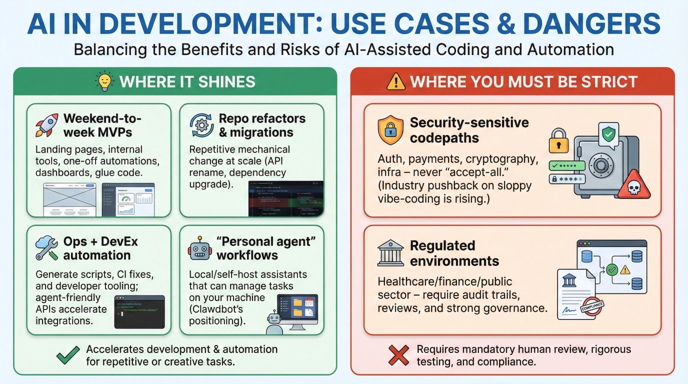 - Security-sensitive codepaths: Auth, payments, cryptography, infra – never “accept-all.” (Industry pushback on sloppy vibe-coding is rising.)