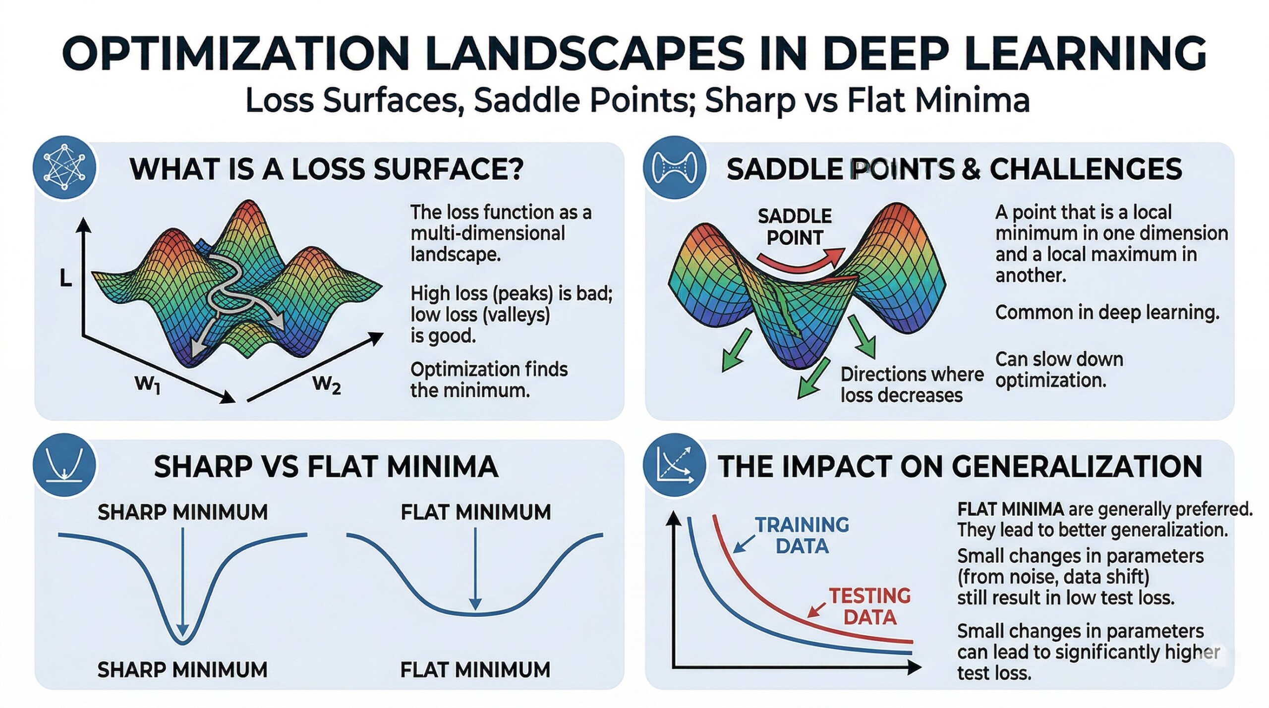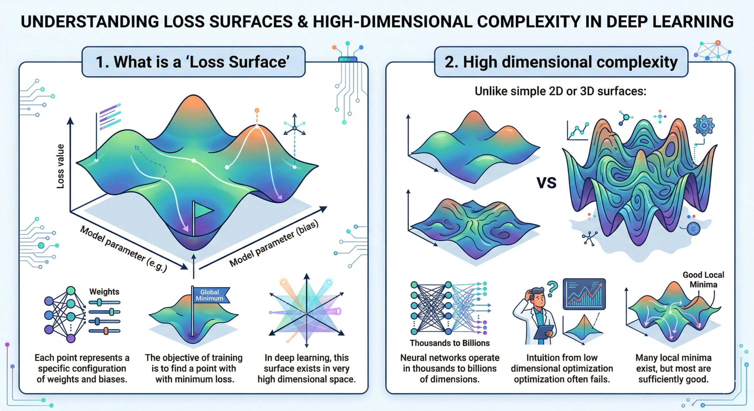 This landscape, often called the loss surface or optimization landscape, is not smooth or simple. It contains hills, valleys, plateaus, and flat regions that can slow or mislead the training process. Understanding this terrain is essential because it directly affects how well a model learns and performs on unseen data.