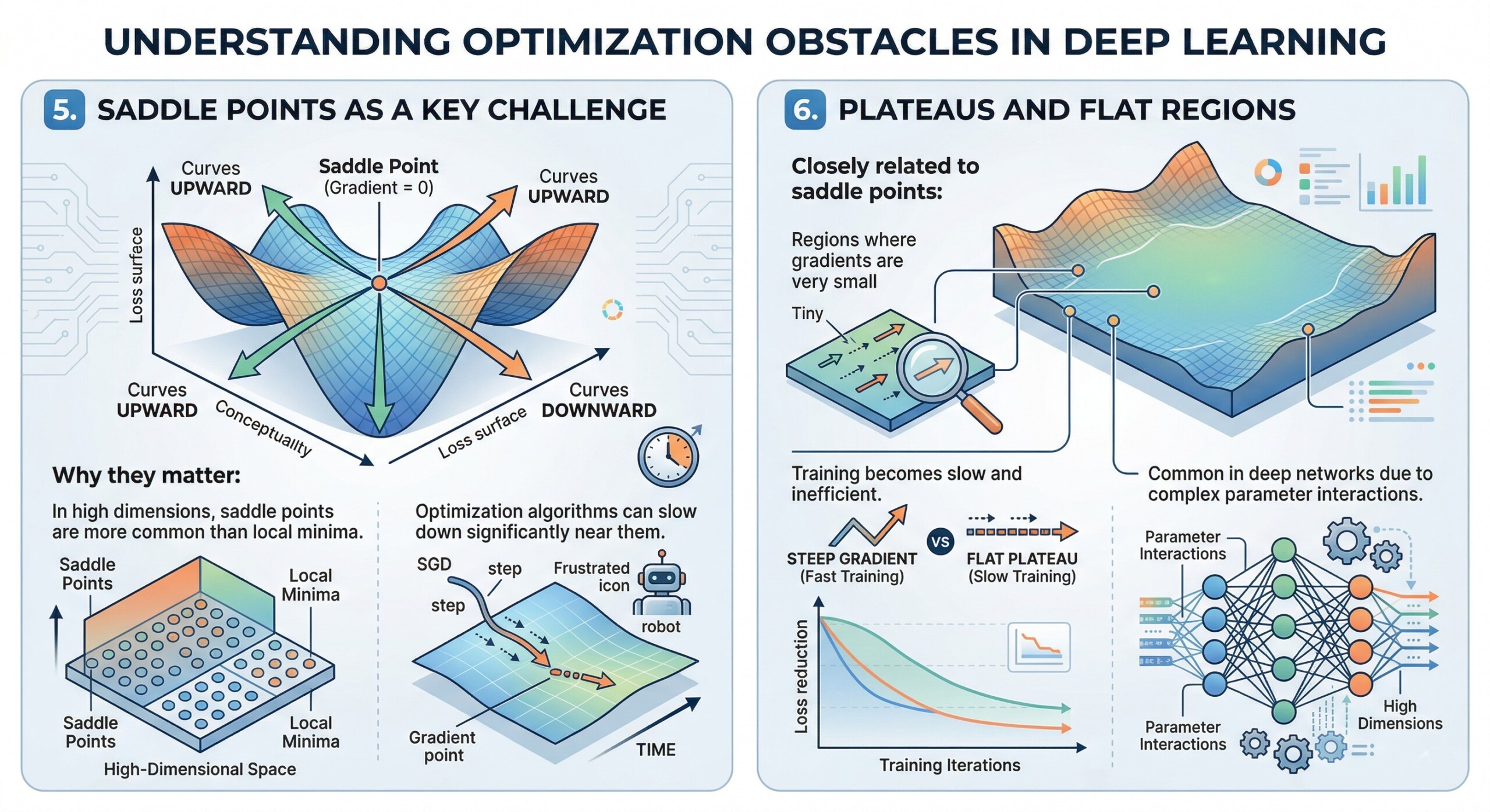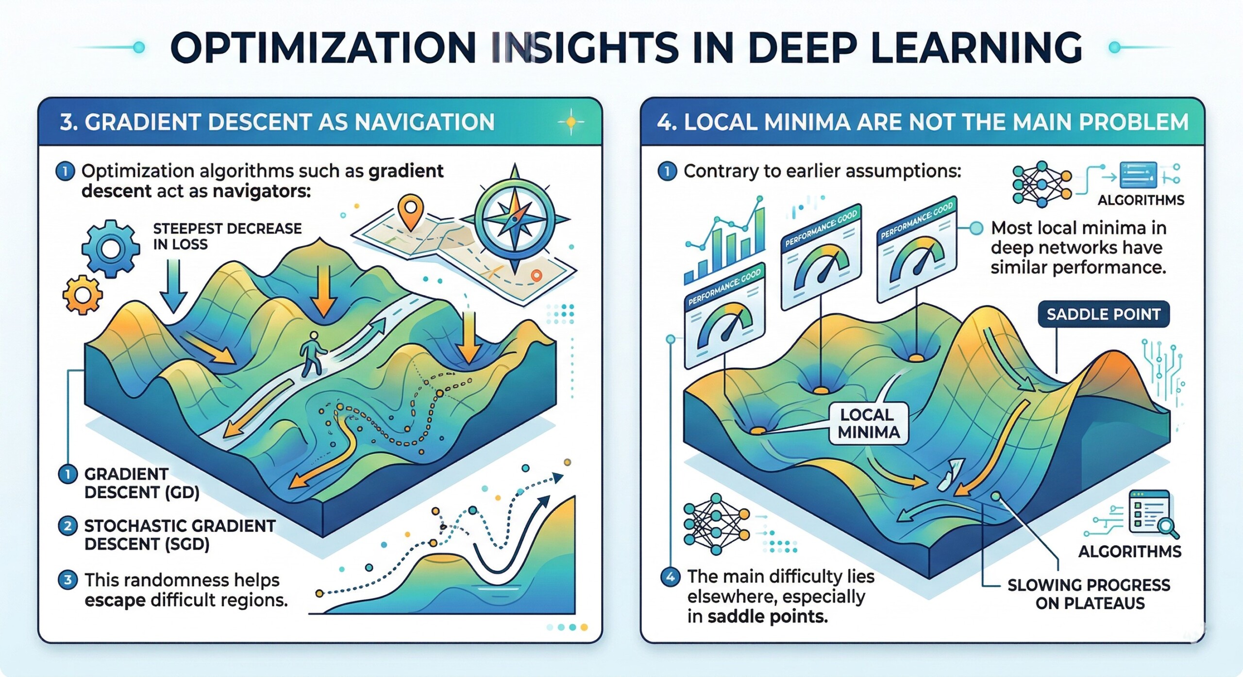 Saddle points, rather than local minima, represent a major challenge in high dimensional optimization. This has influenced the design of modern optimization algorithms, which use randomness, momentum, and adaptive strategies to move efficiently through the landscape.