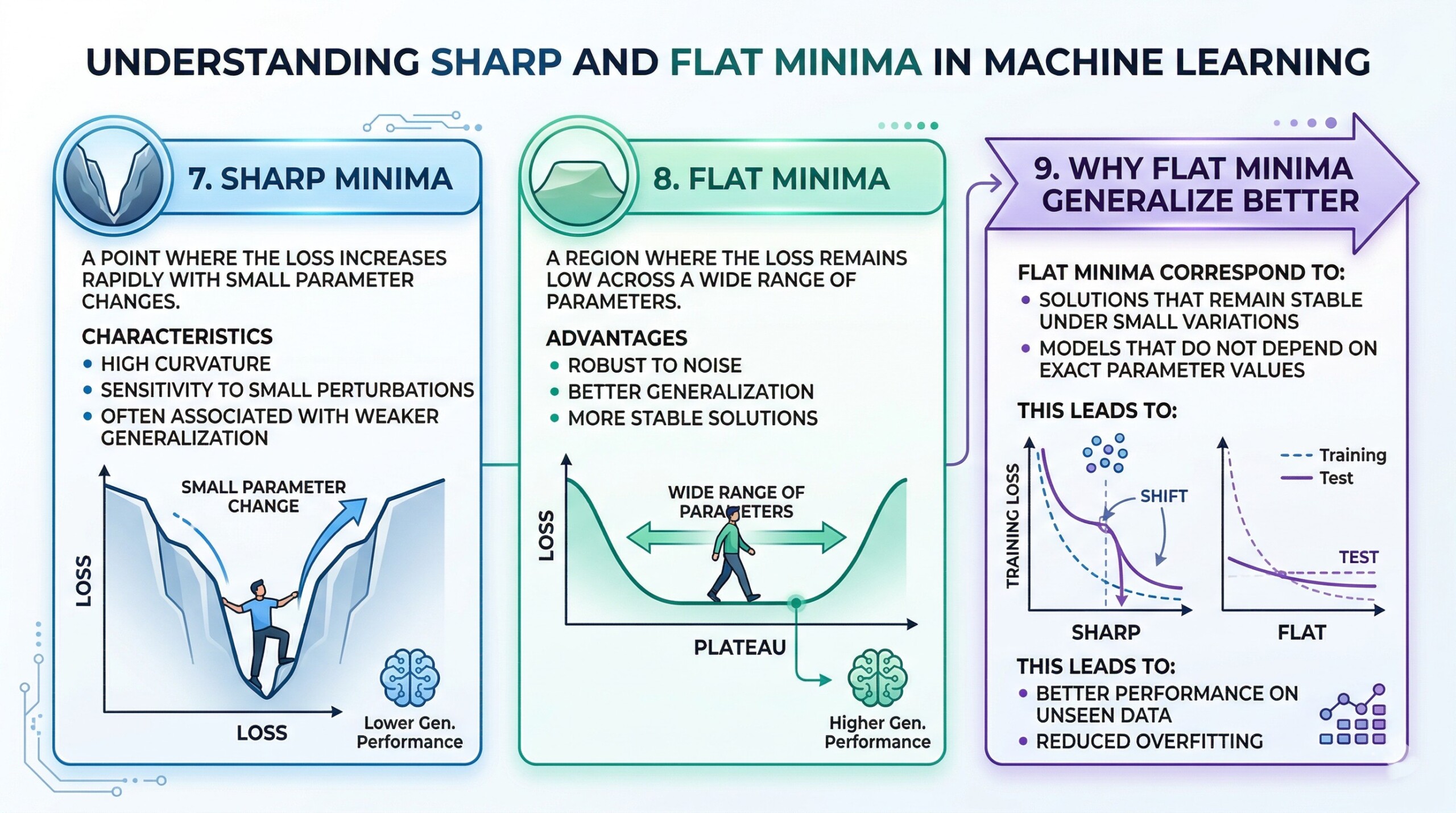 A key insight from modern research is that not all minima are equally useful. While many parameter configurations may achieve low training loss, those located in flat regions of the loss surface tend to perform better on new data and remain more stable.