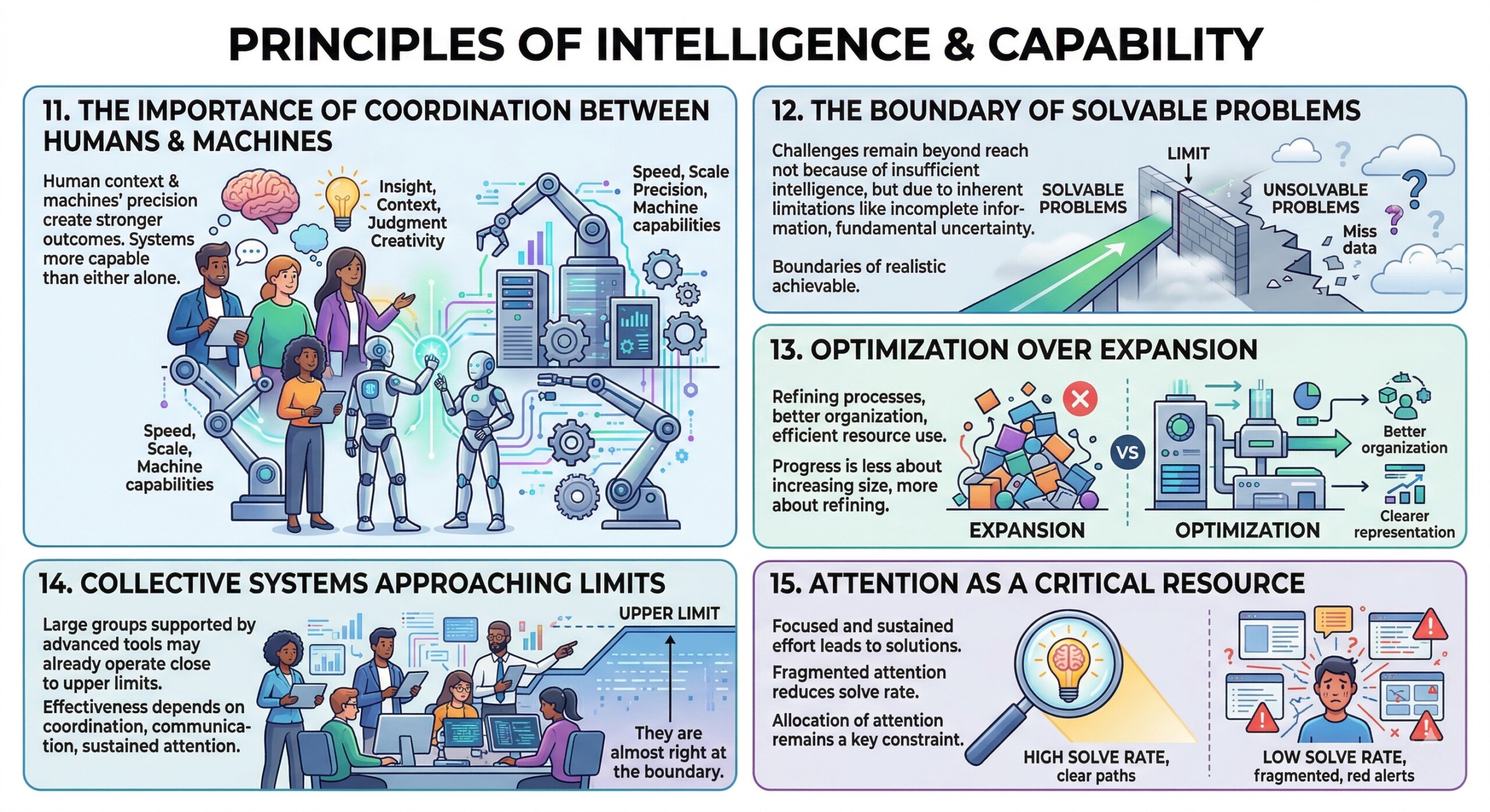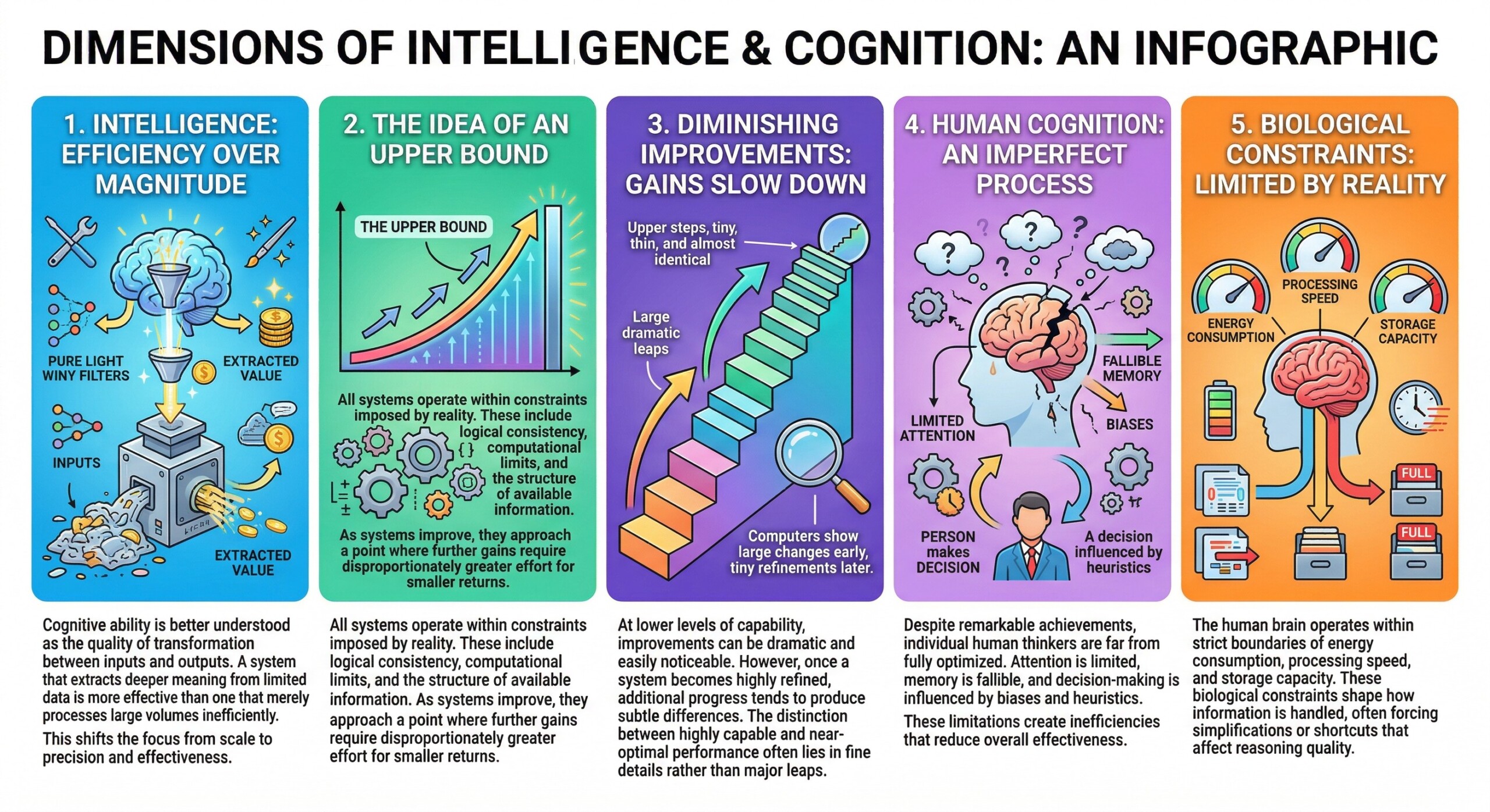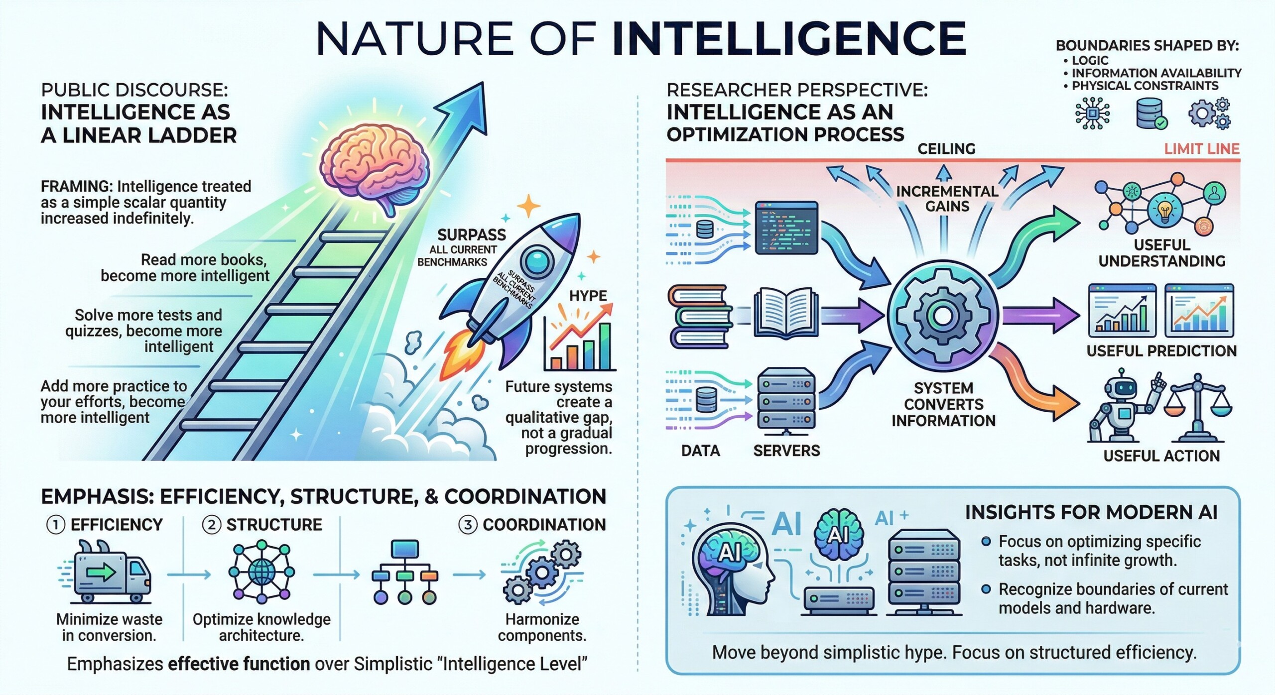When viewed this way, intelligence begins to resemble an optimization process rather than a linear ladder. Systems can improve, but only up to certain boundaries shaped by logic, information availability, and physical constraints. As performance approaches these limits, gains become incremental rather than transformative. This perspective allows for a more nuanced understanding of both human cognition and artificial systems, emphasizing efficiency, structure, and coordination over simplistic notions of raw “intelligence level.”