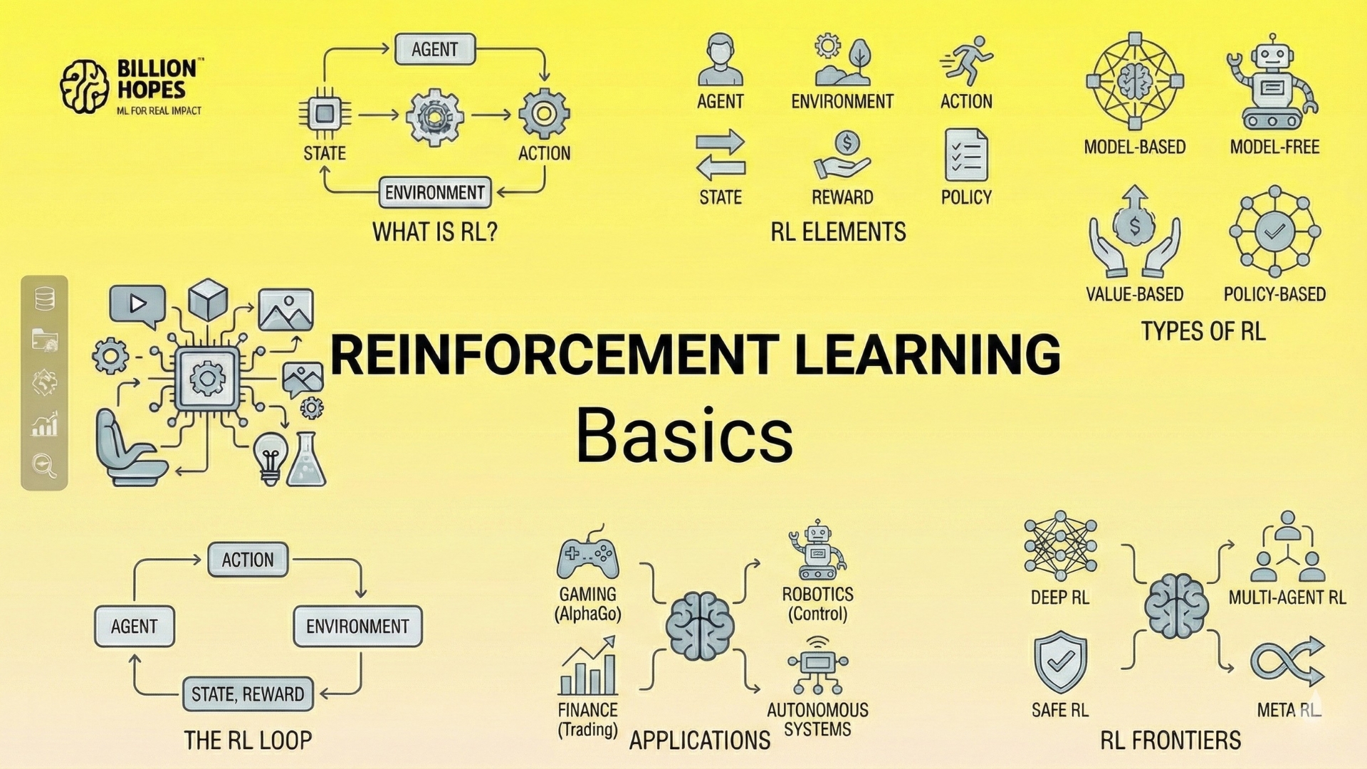 TECHNICAL DETAILS (RL with ecosystem): Reinforcement Learning (RL) systems are built as closed-loop decision-making frameworks in which an agent interacts continuously with an environment to optimize long-term outcomes. The environment may be a physical system, a simulated world, a digital platform, or an abstract decision process. The state represents the agent’s current observation or internal belief about the environment, which may be fully observable, partially observable, noisy, or delayed. At each step, the agent selects an action from an action space that may be discrete or continuous. The environment responds by transitioning to a new state and emitting a reward signal, which encodes task objectives but does not specify correct behavior explicitly. A policy maps states (or observations) to actions, while value functions estimate expected cumulative reward over time. Learning updates are driven by experience, using trajectories of state–action–reward transitions. Core RL mechanisms include exploration strategies, credit assignment, temporal-difference learning, and discounting to balance short-term versus long-term outcomes. In practice, RL systems are often combined with function approximators such as deep neural networks, enabling Deep Reinforcement Learning for high-dimensional state spaces. Training frequently occurs in simulators to reduce cost and risk, with policies later transferred to real-world environments under strict constraints. Modern RL ecosystems integrate learning with planning, constraints, safety layers, and human oversight. Techniques such as reward shaping, constrained optimization, offline RL, imitation learning, and human-in-the-loop feedback are used to improve stability and alignment. Execution policies are typically bounded by rule-based guards and monitoring systems rather than deployed as unconstrained learners. RL research and applications are supported by platforms and frameworks such as OpenAI Gym, Stable Baselines, RLlib, DeepMind control suites, and simulation environments built on MuJoCo, Isaac Sim, and Unity ML-Agents. Major contributions to the field were shaped by pioneers including Richard Sutton and Andrew Barto (formal RL foundations), Christopher Watkins (Q-learning), David Silver (deep RL and game-playing systems), Pieter Abbeel (robotic learning), and Sergey Levine (model-based and scalable RL). Together, mathematical optimization, learning algorithms, simulation infrastructure, safety constraints, and human governance transform reinforcement learning from abstract trial-and-error into deployable decision systems aligned with real-world objectives and limitations. Excellent individualised mentoring programmes available.