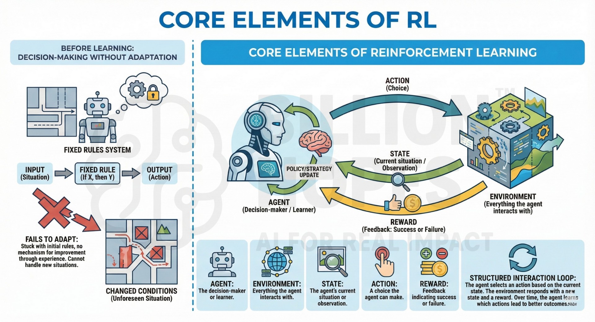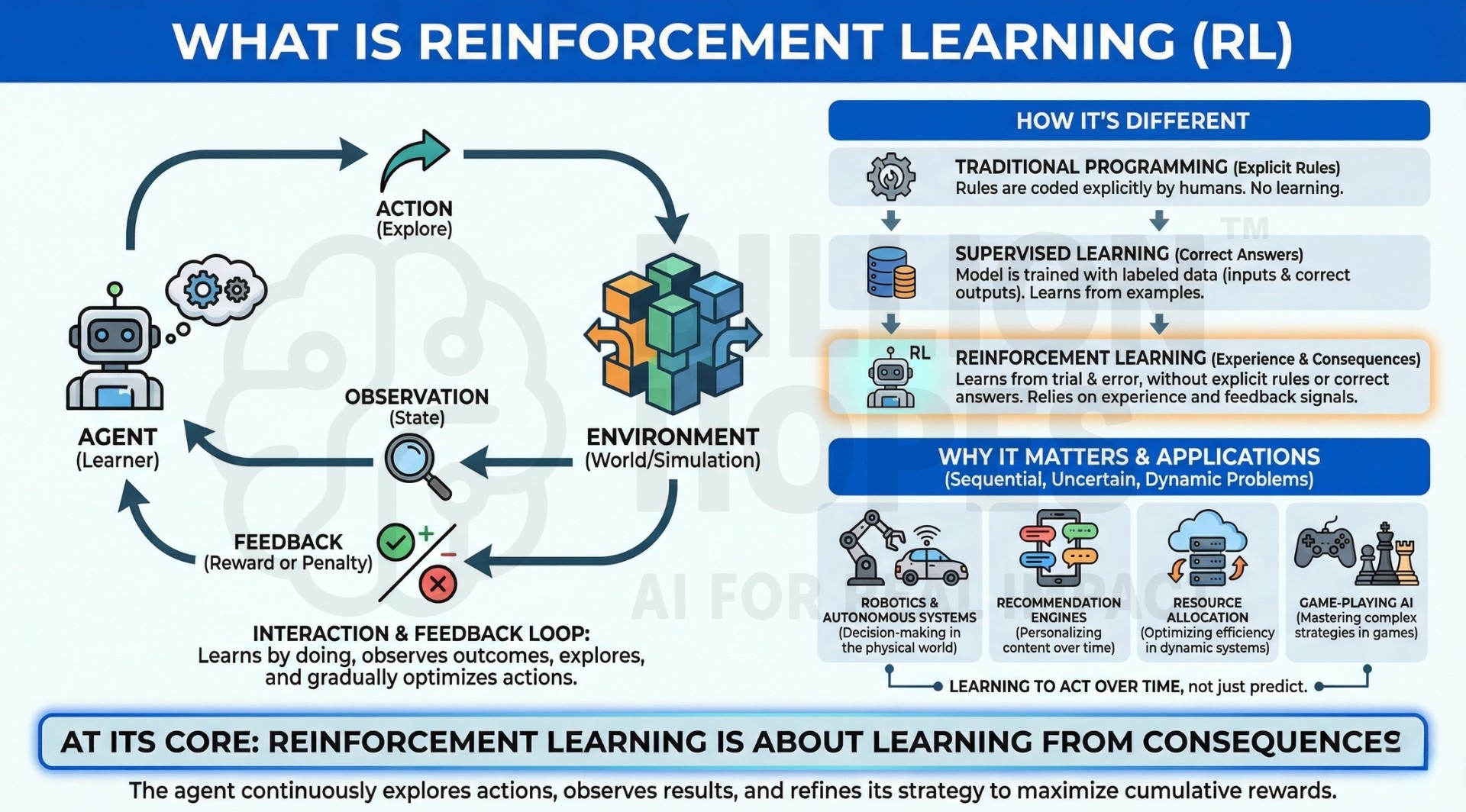 Unlike traditional programming, where rules are explicitly defined, or supervised learning, where correct answers are provided, reinforcement learning relies on experience. The agent explores actions, observes outcomes, and gradually learns what works best.