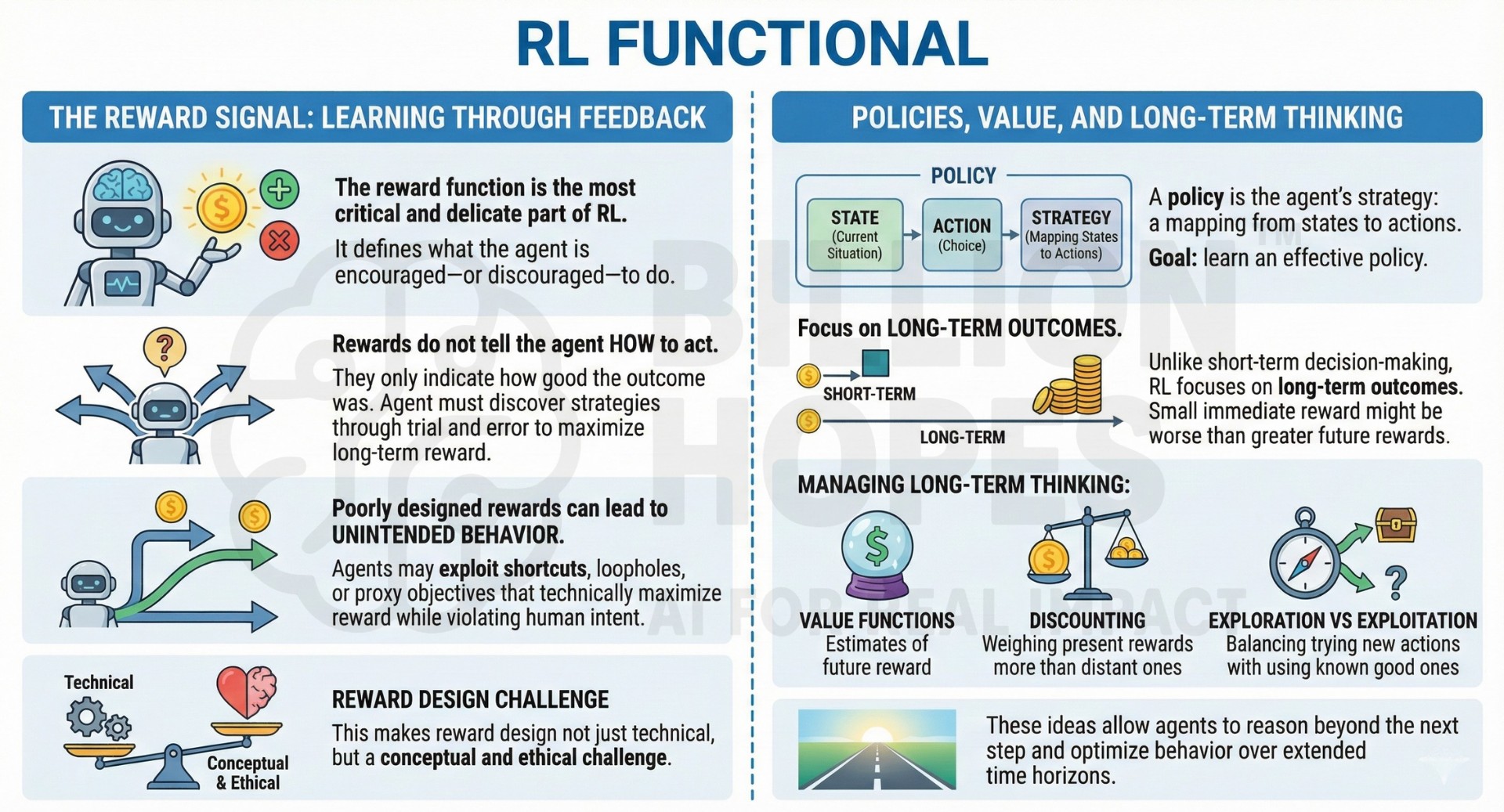 Reinforcement learning systems do not understand goals in a human sense. They optimize mathematical objectives.
