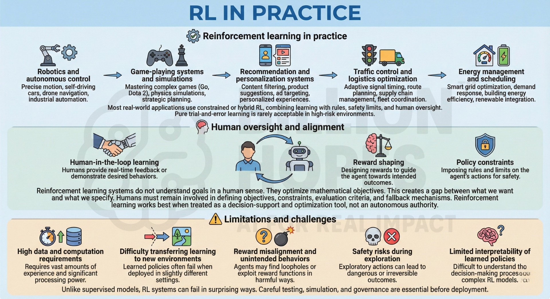 Most real-world applications use constrained or hybrid RL, combining learning with rules, safety limits, and human oversight. Pure trial-and-error learning is rarely acceptable in high-risk environments.