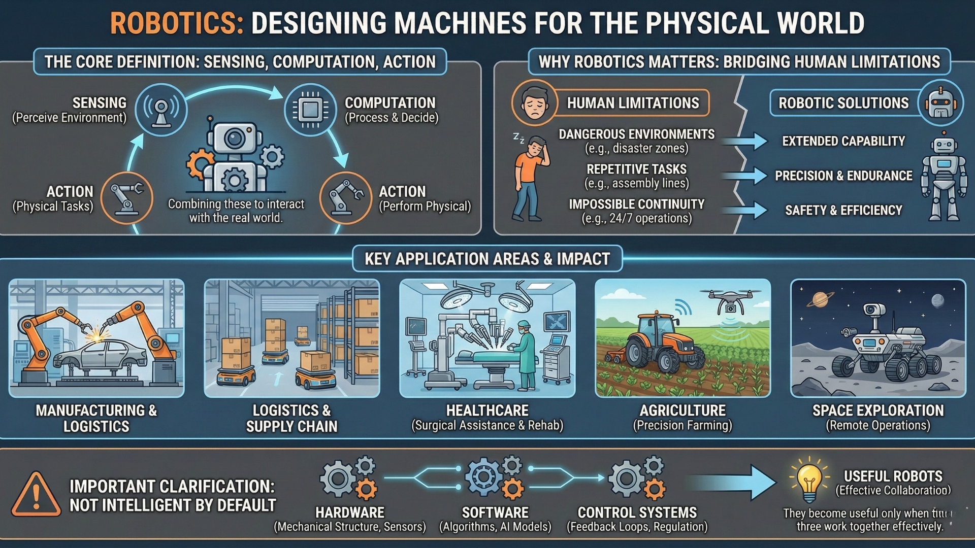 Robotics matters because the physical world still requires movement, manipulation, and precision. From manufacturing and logistics to healthcare, agriculture, and space exploration, robots extend human capability into environments that are dangerous, repetitive, or impossible for humans to operate in continuously.