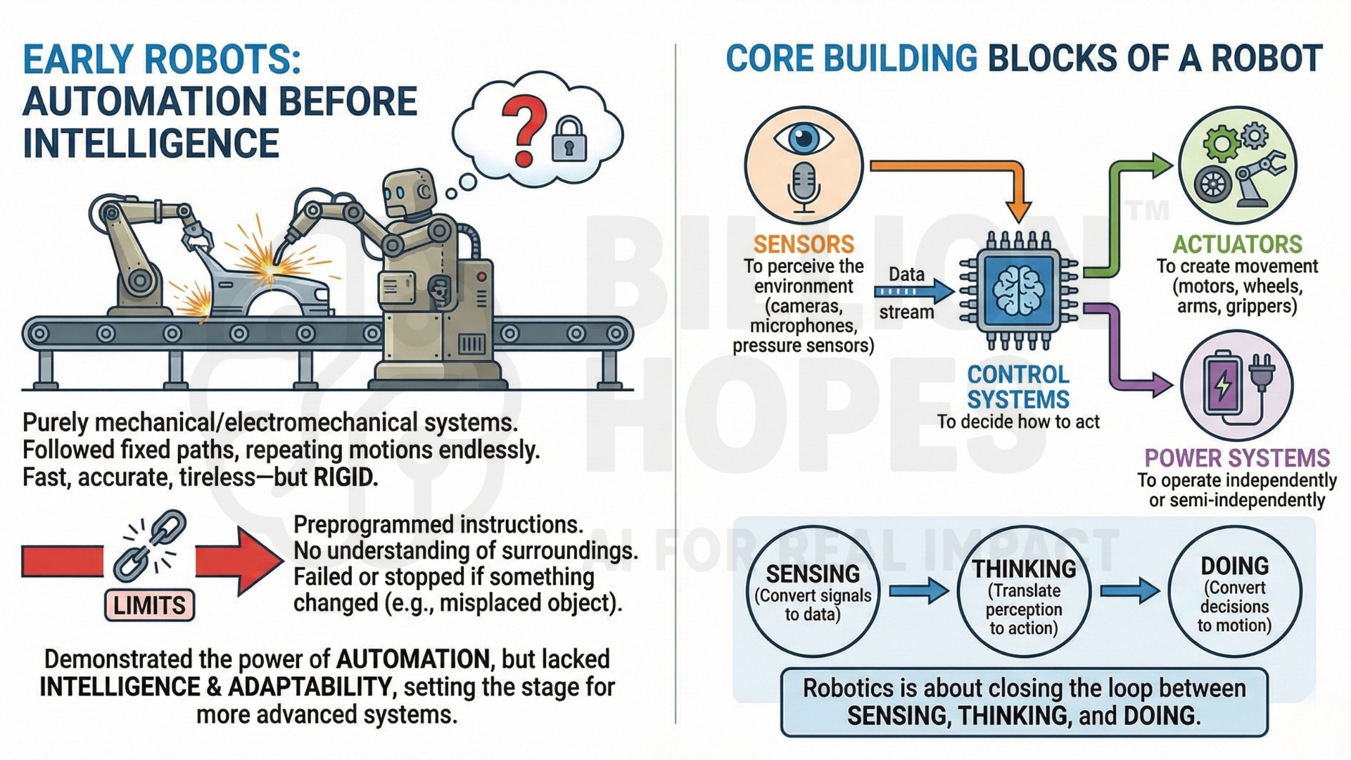 The earliest robots were purely mechanical or electromechanical systems. Industrial robots in factories followed fixed paths and repeated the same motions endlessly. They were fast, accurate, and tireless—but also rigid.