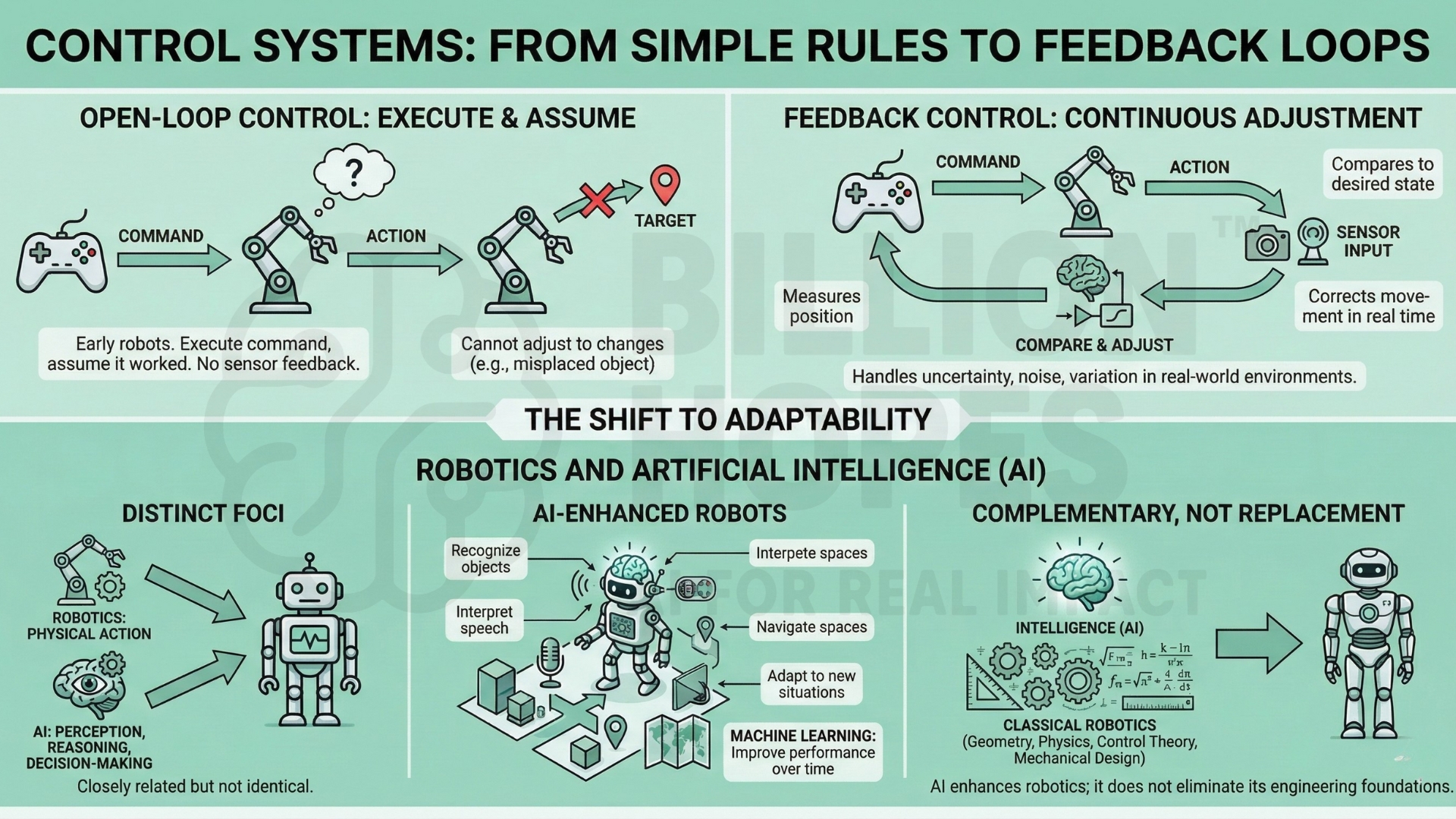 Early robots used open-loop control: execute a command and assume it worked. Modern robots rely on feedback control, continuously adjusting actions based on sensor input.