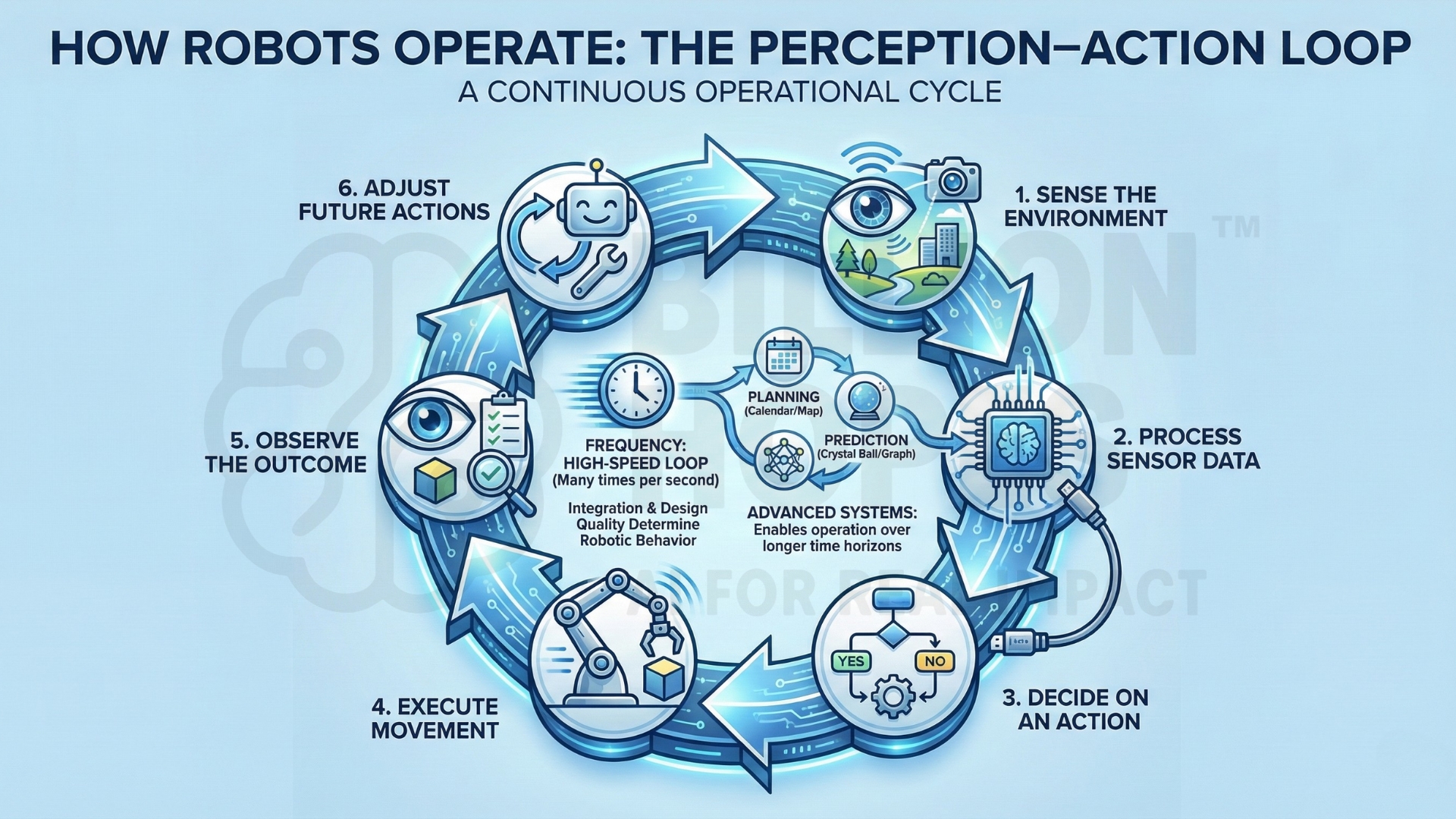 In advanced systems, this loop includes planning, prediction, and learning, enabling robots to operate over longer time horizons.