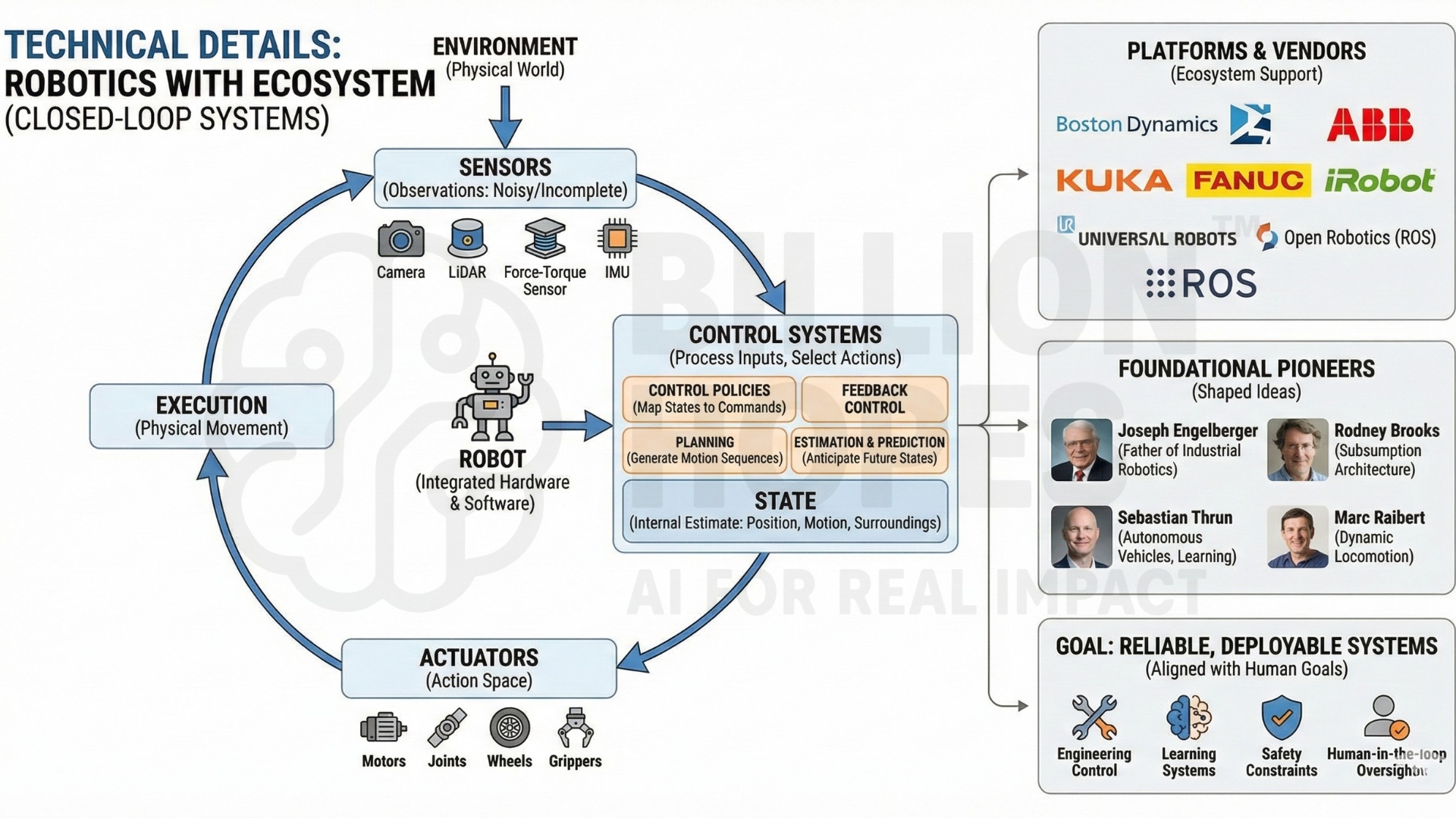 TECHNICAL DETAILS (Robotics with ecosystem): Robots are built from tightly integrated hardware and software components operating as closed-loop systems. The environment is the physical world in which the robot functions, while the state represents its internal estimate of position, motion, and surroundings. Sensors – such as cameras, LiDAR, force-torque sensors, and IMUs—provide observations that may be noisy or incomplete. Control systems process these inputs to select actions from an action space defined by actuators like motors, joints, wheels, and grippers. Control policies map sensed states to motor commands using feedback control. Planning generates motion sequences, while estimation and prediction anticipate future states. Execution converts commands into physical movement, and feedback continuously updates internal models. In modern robotics, these layers are supported by platforms and vendors such as Boston Dynamics, ABB, KUKA, Fanuc, iRobot, Universal Robots, and research-driven organizations like Open Robotics (creators of ROS). Foundational ideas in robotics were shaped by pioneers such as Joseph Engelberger (often called the father of industrial robotics), Rodney Brooks (subsumption architecture), Sebastian Thrun (autonomous vehicles and robotics learning), and Marc Raibert (dynamic locomotion). Together, engineering control, learning systems, safety constraints, and human-in-the-loop oversight turn raw machinery into reliable, deployable robotic systems aligned with human goals.