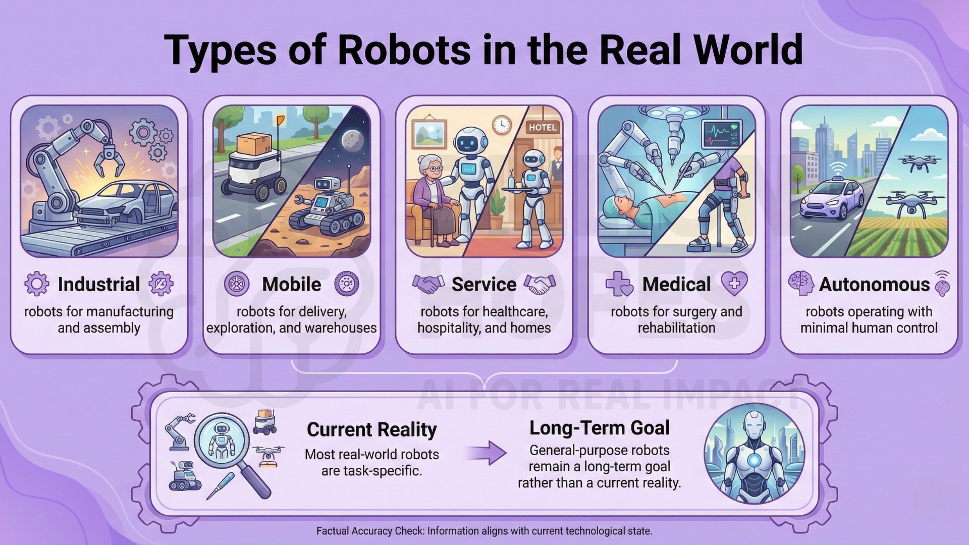 Most real-world robots are task-specific. General-purpose robots remain a long-term goal rather than a current reality.