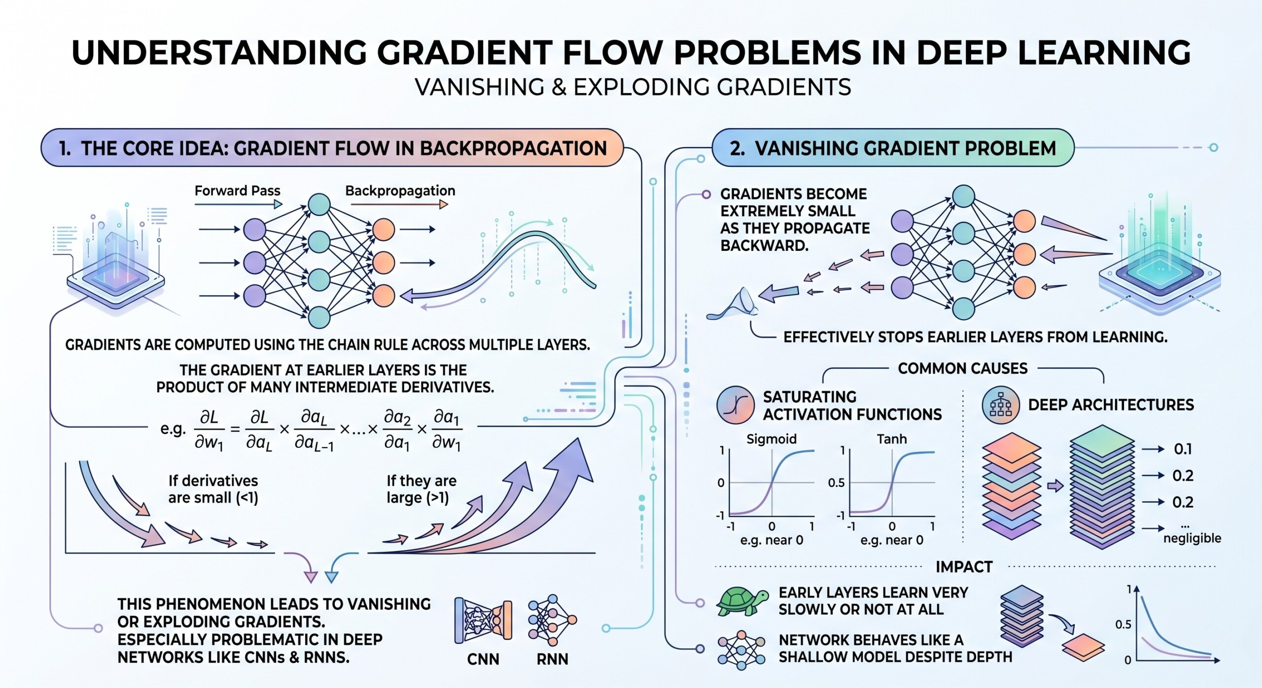 This phenomenon directly leads to vanishing or exploding gradients and is especially problematic in deep networks like CNNs and RNNs.