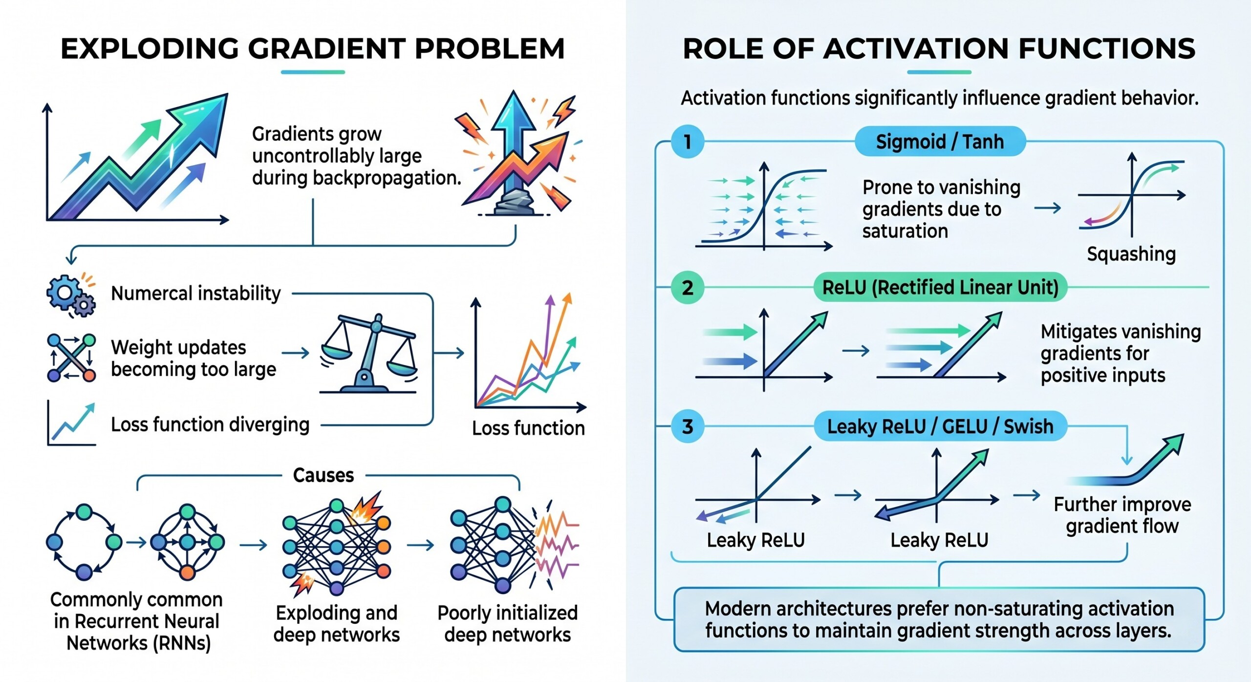 • Sigmoid / Tanh → prone to vanishing gradients due to saturation
