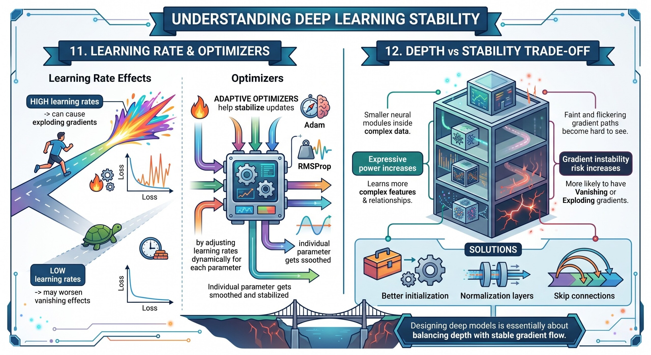 As networks grow deeper and more complex, issues like vanishing gradients, exploding gradients, poor weight initialization, and lack of proper normalization become more pronounced. These problems are not just theoretical but directly impact convergence speed, model accuracy, and reproducibility. In this lecture, we explore the underlying mechanics of these challenges and the practical techniques used to address them.