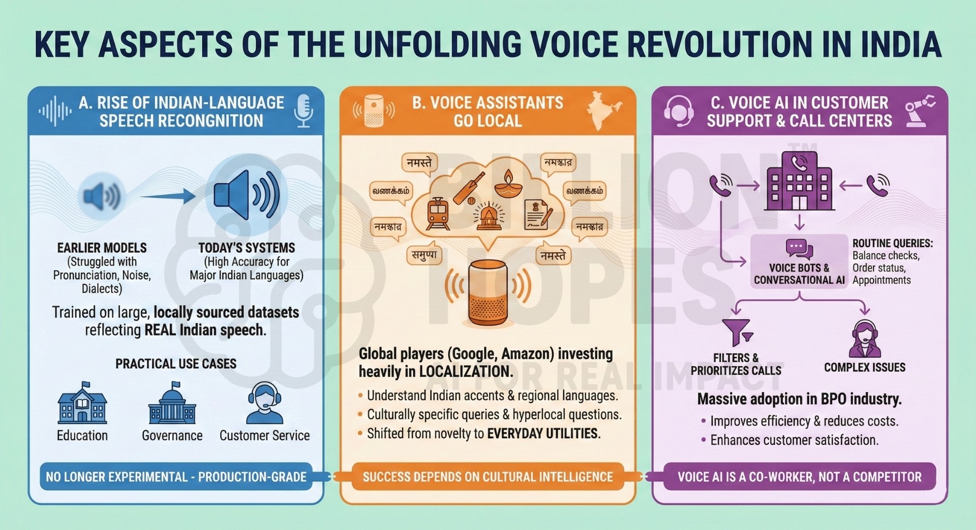 C. Voice AI in Customer Support & Call Centers: India’s massive call center and BPO industry is rapidly adopting voice bots and conversational AI. These systems handle routine queries such as balance checks, order status, and appointment scheduling. Instead of replacing humans, Voice AI filters and prioritizes calls, allowing agents to focus on complex issues. This improves efficiency, reduces costs, and enhances customer satisfaction. Voice AI is becoming a co-worker, not a competitor, in India’s service economy.