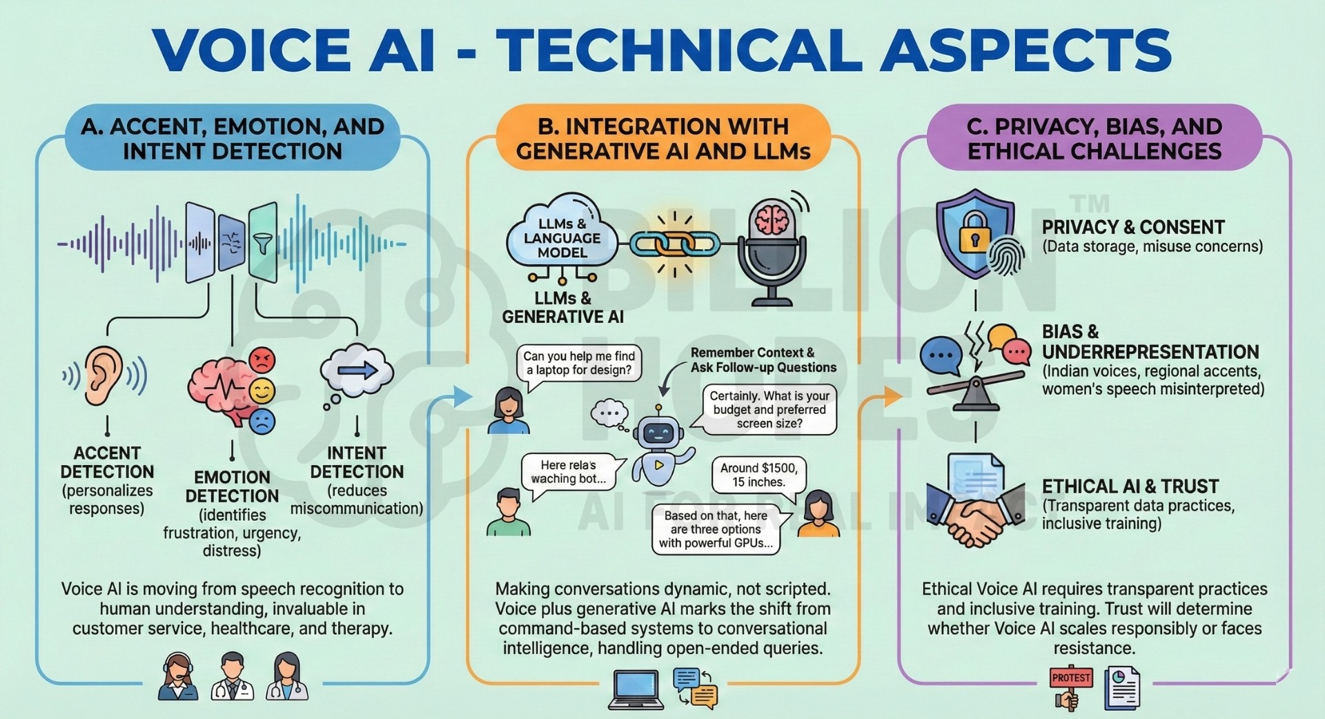 C. Privacy, Bias, and Ethical Challenges: Voice data is deeply personal, raising serious concerns about consent, storage, and misuse. Indian voices – especially regional accents and women’s speech – can be misinterpreted or underrepresented in datasets. This leads to bias and unequal performance. Ethical Voice AI requires transparent data practices and inclusive training. Trust will determine whether Voice AI scales responsibly or faces resistance.