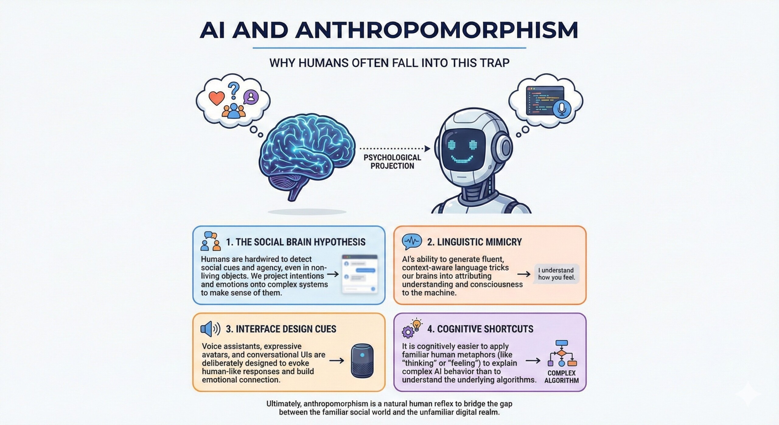 Anthropomorphism means attributing human qualities, intentions, emotions, or consciousness to non-human things like animals, objects, or AI systems. It’s when we treat something non-human as if it thinks or feels like a person.